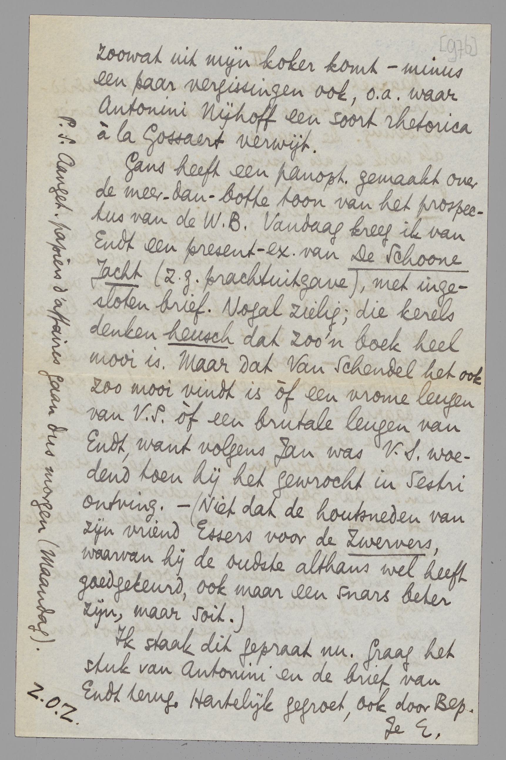 Gans heeft een panopt. gemaakt over de meer-dan-botte toon van het prospectus van de W.B. Vandaag kreeg ik van Endt een present-ex. van De Schoone Jacht (z.g. prachtuitgave), met ingesloten brief. Nogal zielig; die kerels denken heusch dat zoo'n boek heel mooi is. Maar dat Van Schendel het ook zoo mooi vindt is òf een vrome leugen van V.S. òf een brutale leugen van Endt, want volgens Jan was V.S. woedend toen hij het gewrocht in Sestri ontving. - (Niet dat de houtsneden van zijn vriend Essers voor de Zwervers, waarvan hij de oudste althans wel heeft goedgekeurd, ook maar een snars beter zijn, maar soit.)