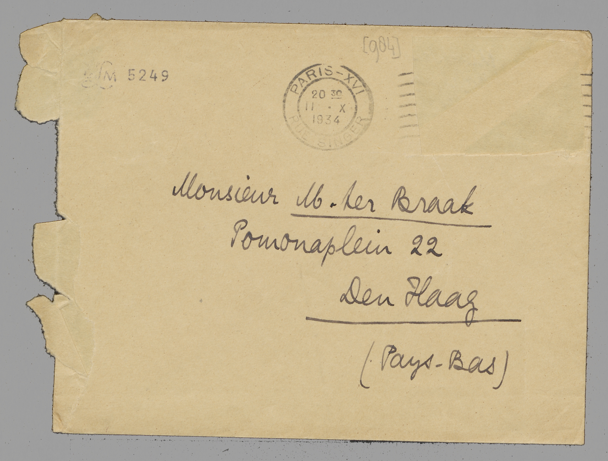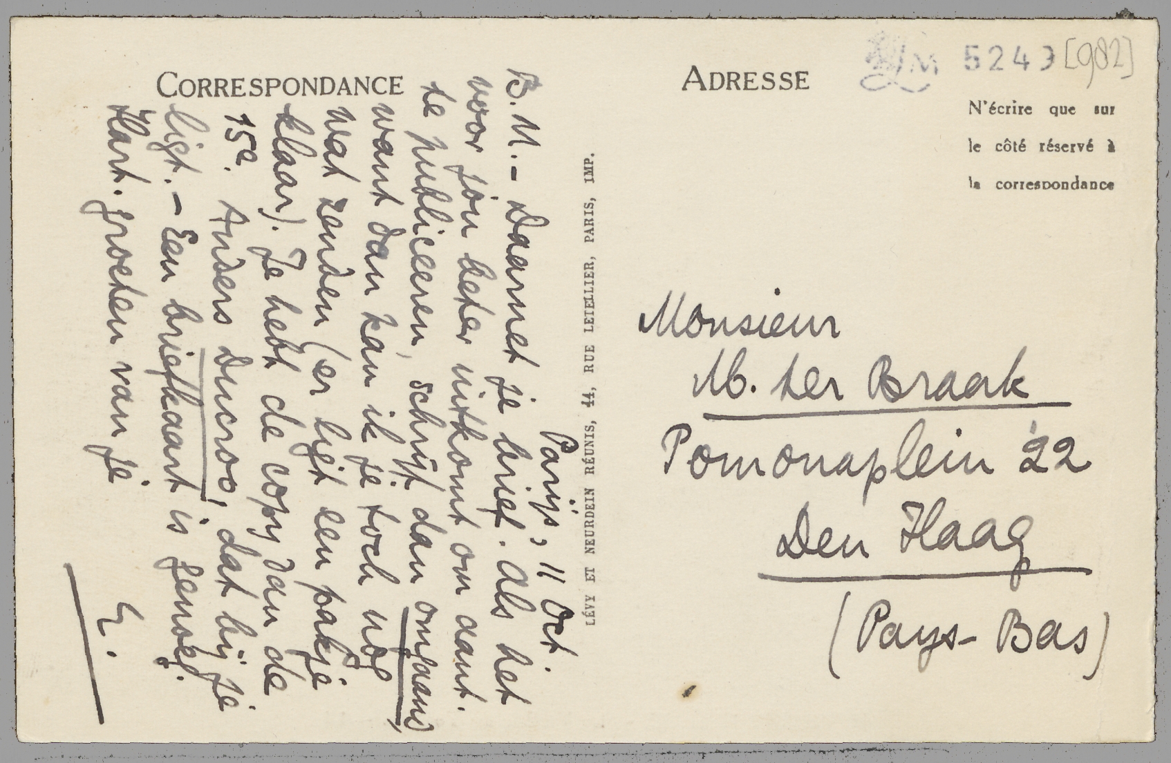 - Ik had deze briefkaart al klaar, maar doe daarnet een ontdekking bij het werken aan Ducroo. In het hfdst. Balekambang, Zandbaai is een bladzij verloren gegaan (wschl. bij Querido) en ik zie geen kans die aan te vullen. Maar ik denk dat jij die blzij wel hebt, in de copy die J. v. N. je gezonden moet hebben - als hij dat tenminste deed, want dat heb ik nooit gehoord. Zou je mij die blzij willen zenden? het moet de 17e bladzij zijn van bovengenoemd hoofdstuk. Het gaat heelemaal over mijn moeder. De laatste woorden van de 16e blzij zijn: ‘een élan, een energie die’, en de eerste woorden van de 18e: ‘zei dat zij er goed uitzag’.