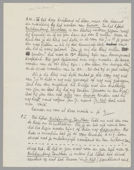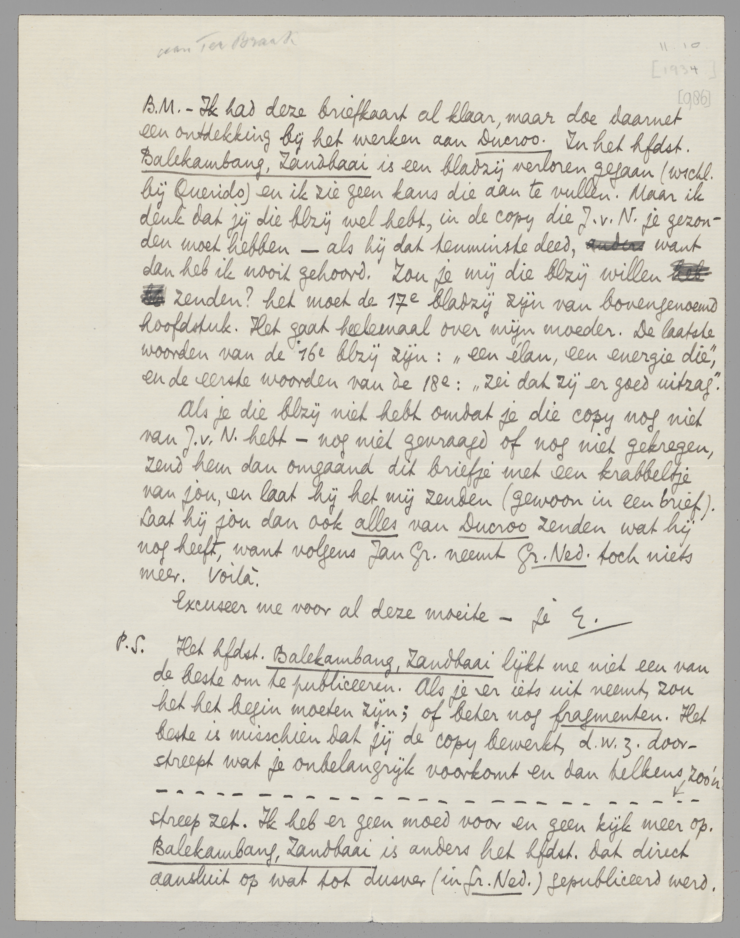 P.S. Het hfdst. Balekambang, Zandbaai lijkt me niet een van de beste om te publiceeren. Als je er iets uit neemt, zou het het begin moeten zijn; of beter nog fragmenten. Het beste is misschien dat jij de copy bewerkt, d.w.z. doorstreept wat je onbelangrijk voorkomt en dan telkens zoo'n---------------------------------------- streep zet. Ik heb er geen moed voor en geen kijk meer op. Balekambang, Zandbaai is anders het hfdst. dat direct aansluit op wat tot dusver (in Gr. Ned.) gepubliceerd werd.