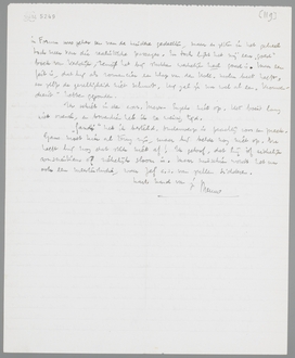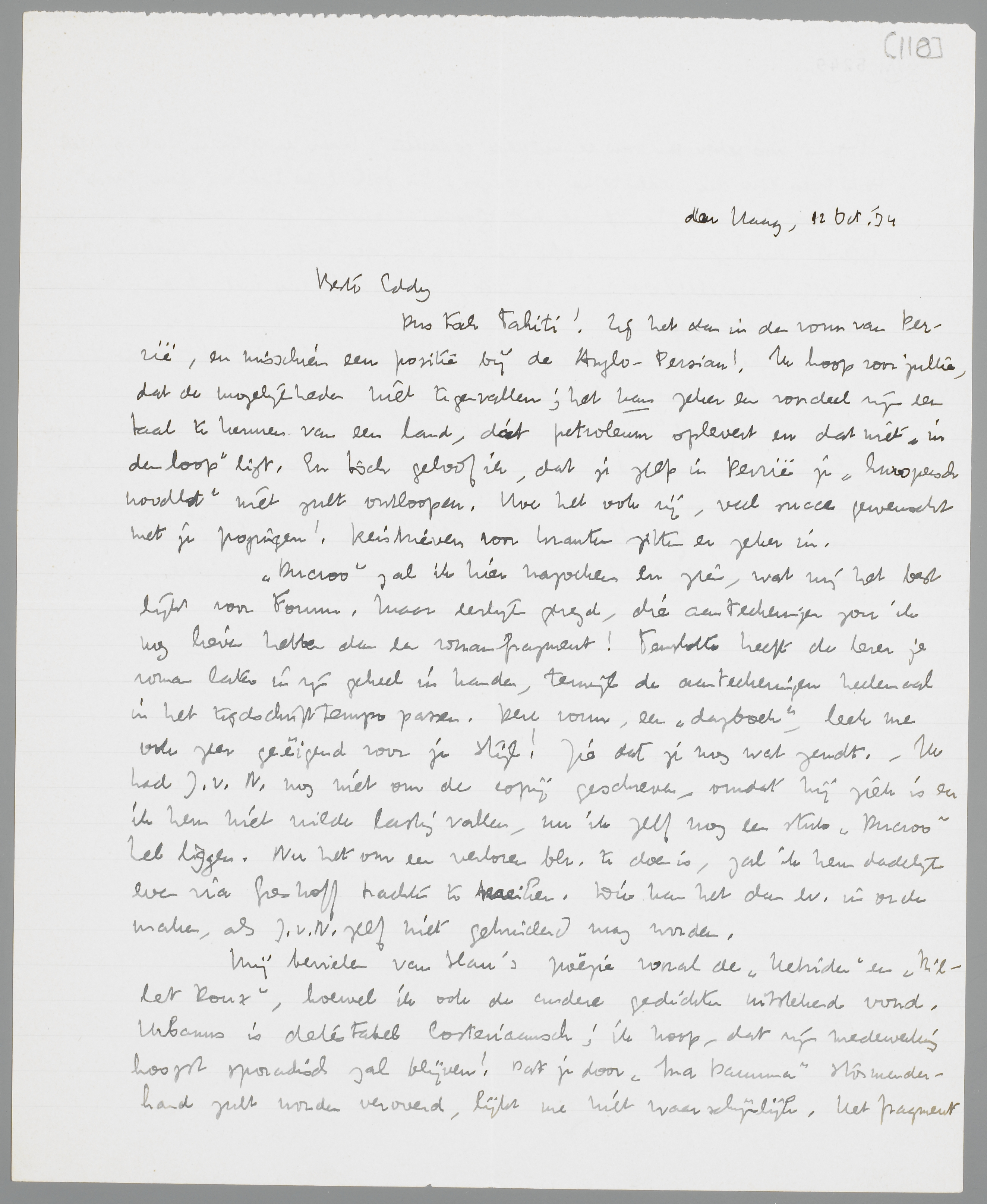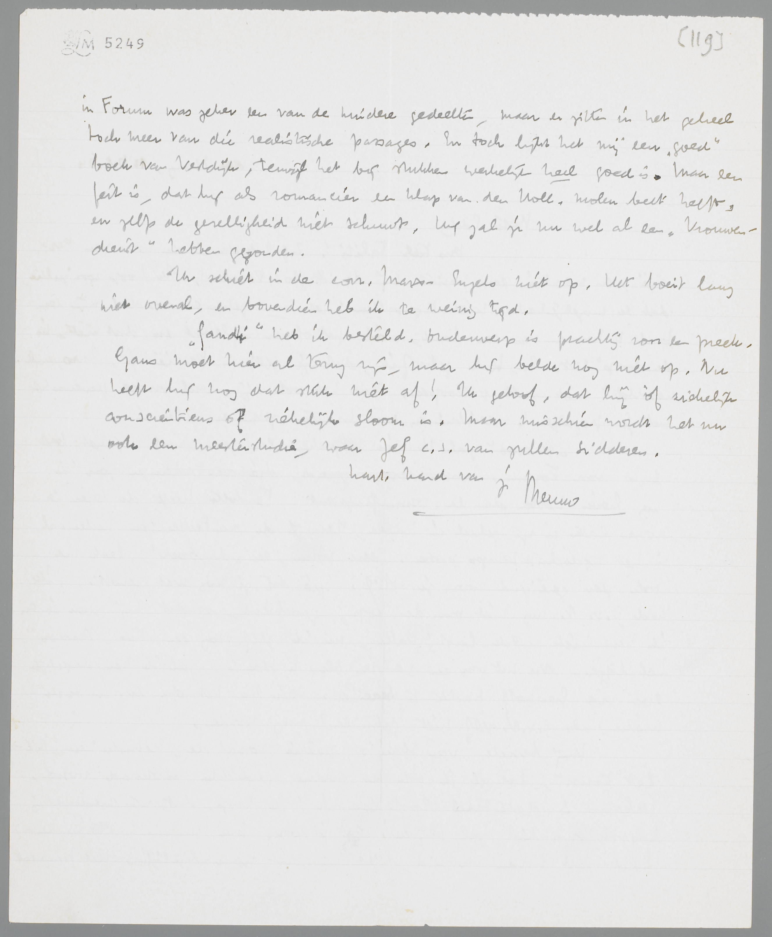 Ducroo zal ik hier nazoeken en zien, wat mij het best lijkt voor Forum. Maar eerlijk gezegd, die aanteekeningen zou ik nog liever hebben dan een romanfragment! Tenslotte heeft de lezer je roman later in zijn geheel in handen, terwijl de aanteekeningen heelemaal in het tijdschrifttempo passen. Deze vorm, een ‘dagboek’, leek me ook zeer geëigend voor je stijl! Zie dat je nog wat zendt. - Ik had J.v.N. nog niet om de copij geschreven, omdat hij ziek is en ik hem niet wilde lastig vallen, nu ik zelf nog een stuk Ducroo heb liggen. Nu het om een verloren blz. te doen is, zal ik hem dadelijk even via Greshoff trachten te bereiken. Die kan het dan ev. in orde maken, als J.v.N. zelf niet gehinderd mag worden.