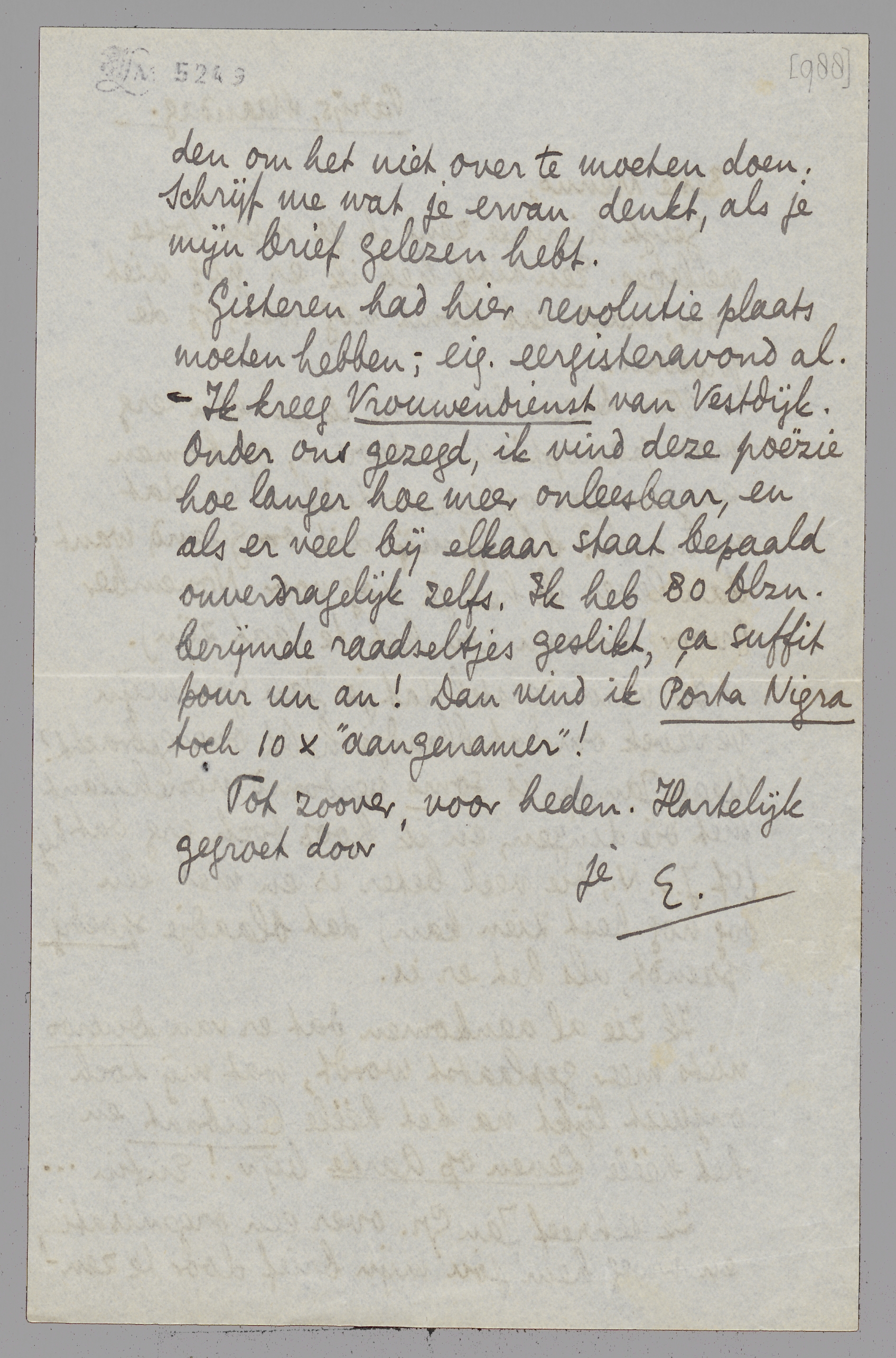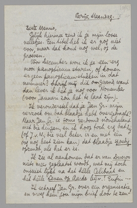 Ik veronderstel dat je Jan Gr. mijn verzoek om dat blaadje hebt overgebracht? Maar Jan Gr. is soms verdomd nonchalant met de dingen, en ik hoop toch erg dat hij (of J.v.N., die veel beter is en met één oog nog best zien kan) dat blaadje spoedig opzendt, als het er is.