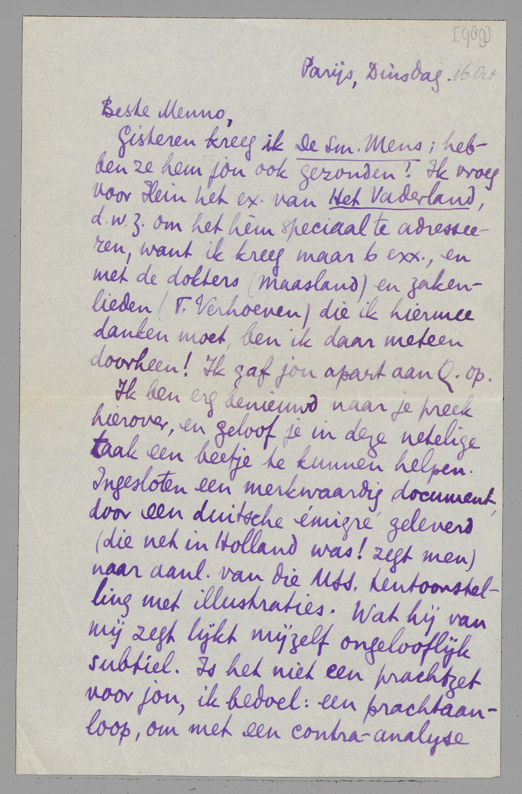 Gisteren kreeg ik De Sm. Mens; hebben ze hem jou ook gezonden? Ik vroeg voor Hein het ex. van Het Vaderland, d.w.z. om het hèm speciaal te adresseeren, want ik kreeg maar 6 exx., en met de dokters (Maasland) en zakenlieden (T. Verhoeven) die ik hiermee danken moet, ben ik daar meteen doorheen! Ik gaf jou apart aan Q. op.
