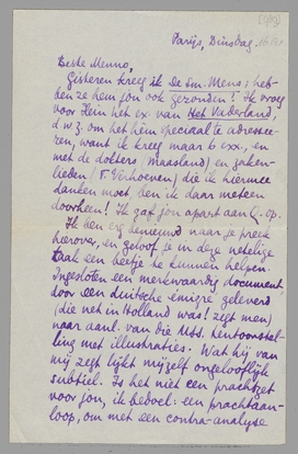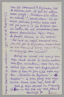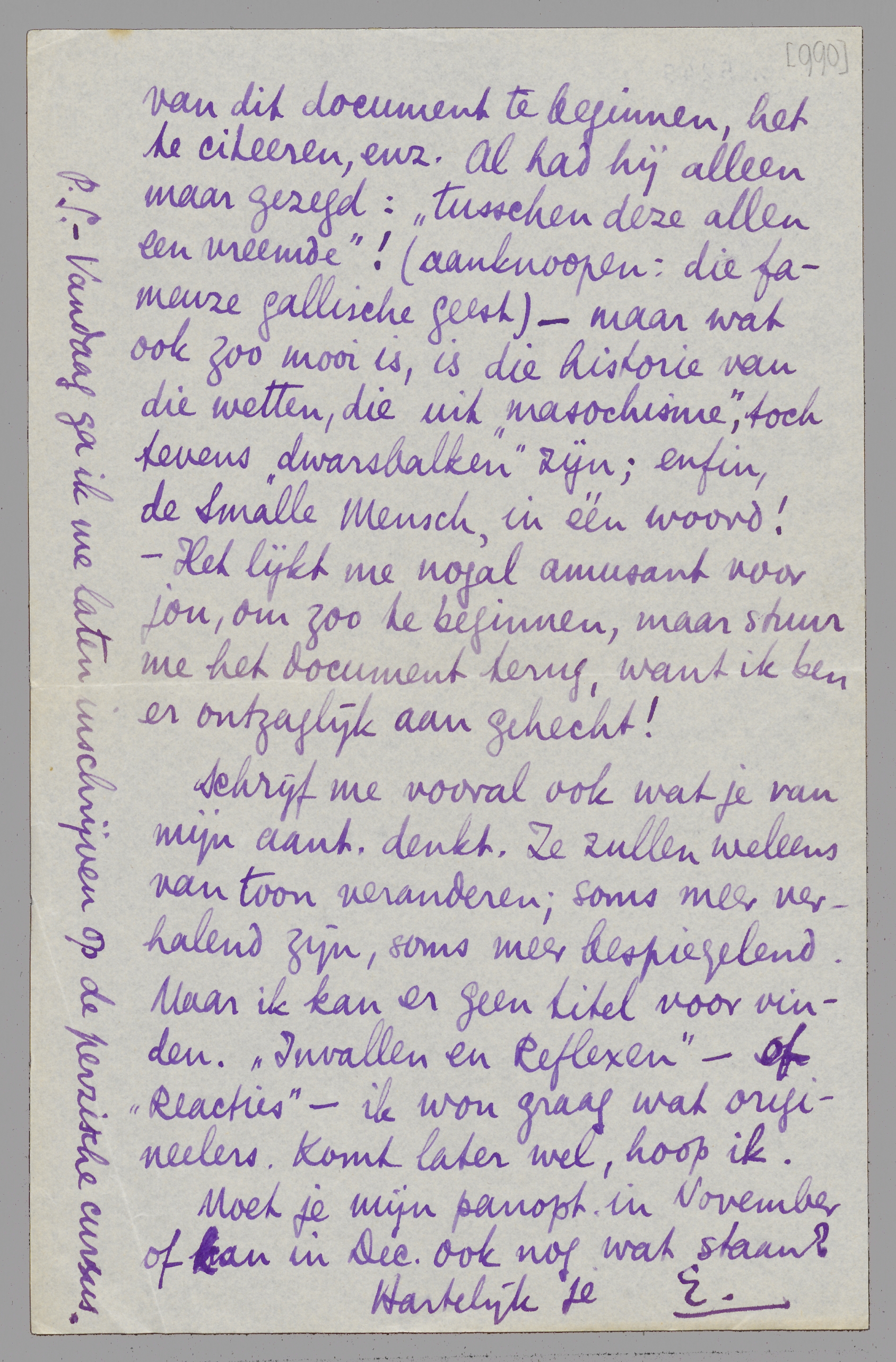 Ik ben erg benieuwd naar je preek hierover, en geloof je in deze netelige taak een beetje te kunnen helpen. Ingesloten een merkwaardig document, door een duitsche émigré geleverd (die net in Holland was! zegt men) naar aanl. van die MSS. tentoonstelling met illustraties. Wat hij van mij zegt lijkt mijzelf ongelooflijk subtiel. Is het niet een prachtzet voor jou, ik bedoel: een prachtaanloop, om met een contra-analyse van dit document te beginnen, het te citeeren, enz. al had hij alleen maar gezegd: ‘tusschen deze allen een vreemde’! (aanknoopen: die fameuze gallische geest) - maar wat ook zoo mooi is, is die historie van die wetten, die uit ‘masochisme’, toch tevens ‘dwarsbalken’ zijn; enfin, de Smalle Mensch, in één woord! - Het lijkt me nogal amusant voor jou, om zoo te beginnen, maar stuur me het document terug, want ik ben er ontzaglijk aan gehecht! Schrijf me vooral ook wat je van mijn aant. denkt. Ze zullen weleens van toon veranderen; soms meer verhalend zijn, soms meer bespiegelend. Maar ik kan er geen titel voor vinden. ‘Invallen en Reflexen’ - of ‘Reacties’ - ik wou graag wat origineelers. Komt later wel, hoop ik.