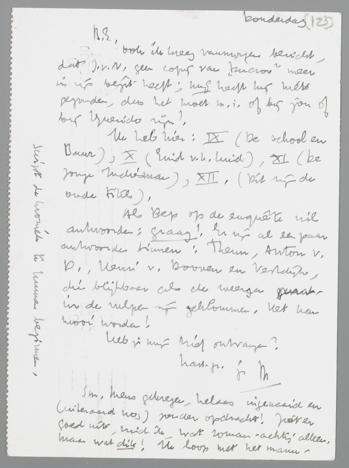 Ook ik kreeg vanmorgen bericht, dat J.v.N. geen copy van Ducroo meer in zijn bezit heeft; mij heeft hij niets gezonden, dus het moet m.i. of bij jou of bij Querido zijn!