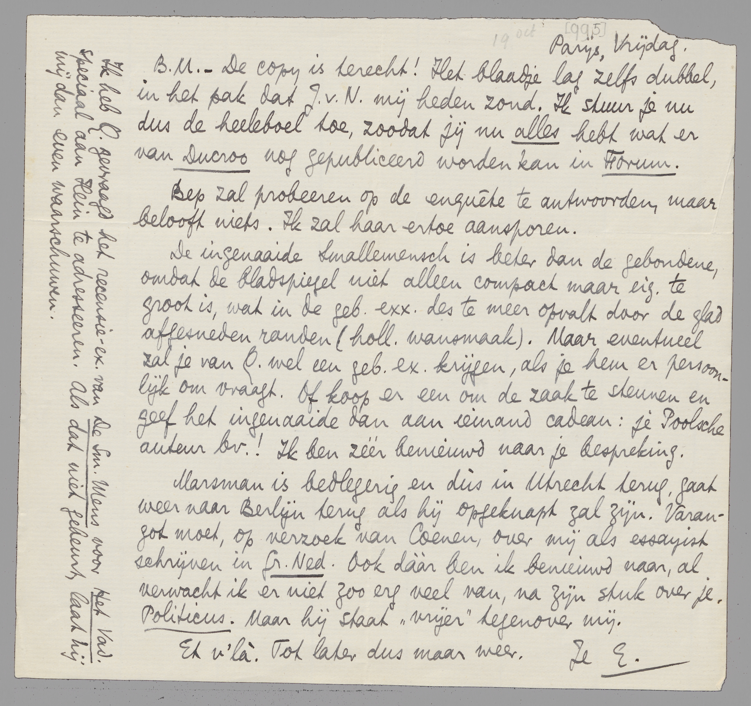 - De copy is terecht! Het blaadje lag zelfs dubbel, in het pak dat J.v.N. mij heden zond. Ik stuur je nu dus de heeleboel toe, zoodat jij nu alles hebt wat er van Ducroo nog gepubliceerd worden kan in Forum.