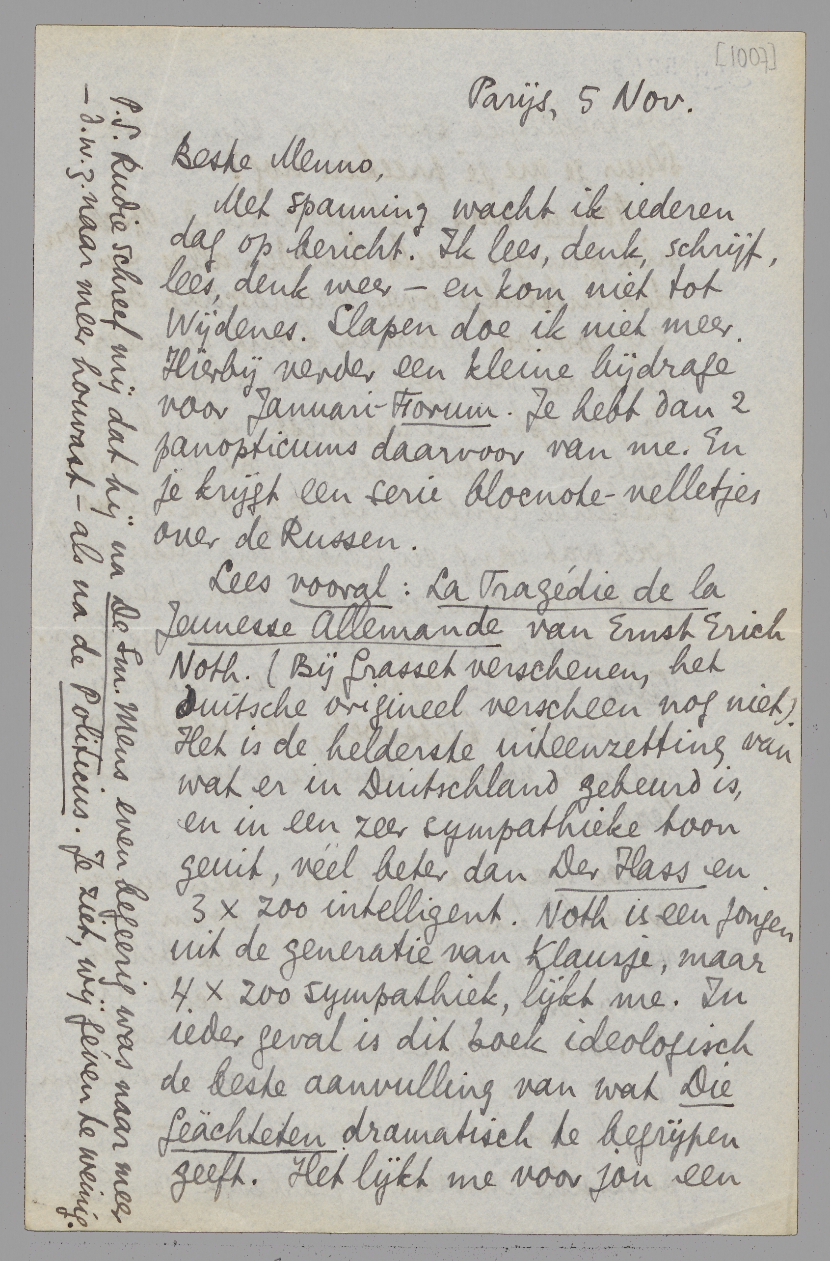 Lees vooral: La Tragédie de la Jeunesse Allemande van Ernst Erich Noth. (Bij Grasset verschenen, het duitsche origineel verscheen nog niet). Het is de helderste uiteenzetting van wat er in Duitschland gebeurd is, en in een zeer sympathieke toon geuit, véél beter dan Der Hass en 3 × zoo intelligent. Noth is een jongen uit de generatie van Klausje, maar 4 × zoo sympathiek, lijkt me. In ieder geval is dit boek ideologisch de beste aanvulling van wat Die Geächteten dramatisch te begrijpen geeft. Het lijkt me voor jou een voortreffelijke stof voor een preek. Stuur je me je preeken nog?