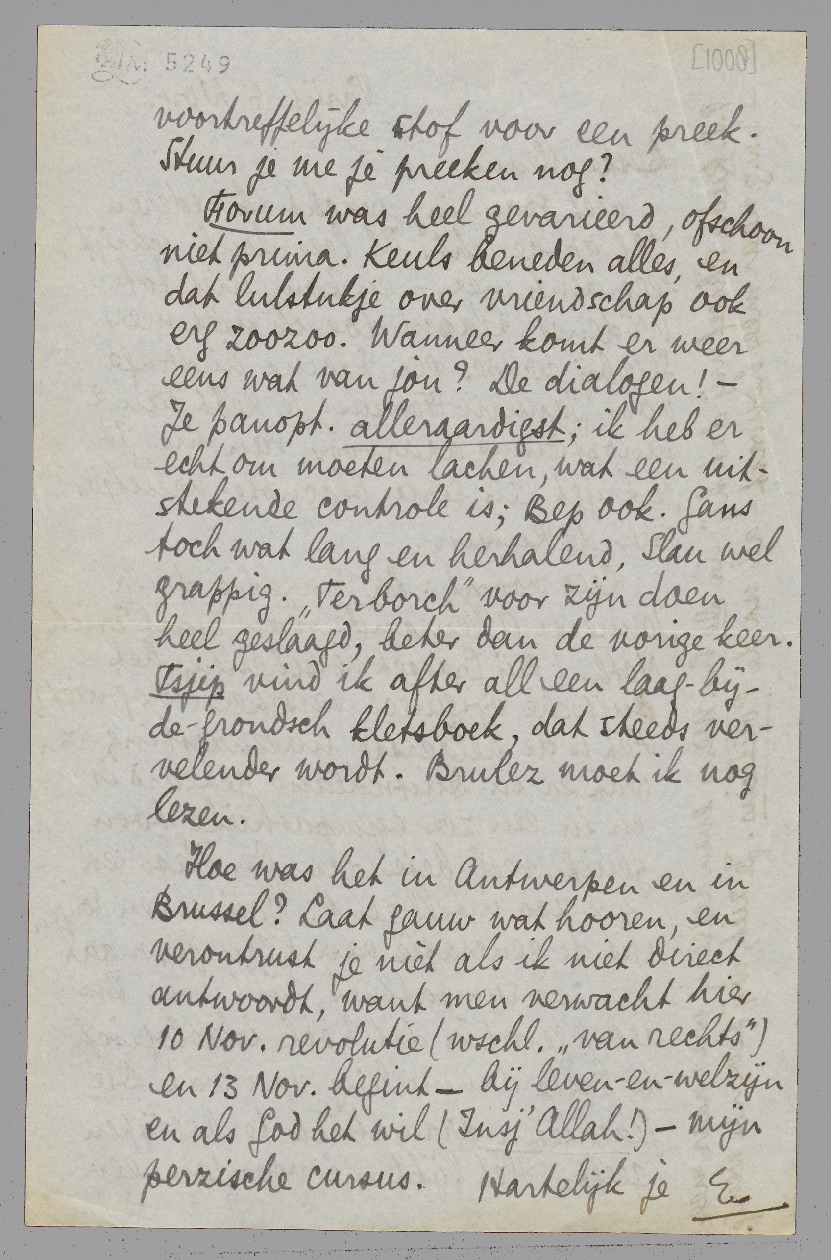 Hoe was het in Antwerpen en in Brussel? Laat gauw wat hooren, en verontrust je niet als ik niet direct antwoordt, want men verwacht hier 10 Nov. revolutie (wschl. ‘van rechts’) en 13 Nov. begint - bij leven-en-welzijn en als God het wil (Insj'Allah!) - mijn perzische cursus.