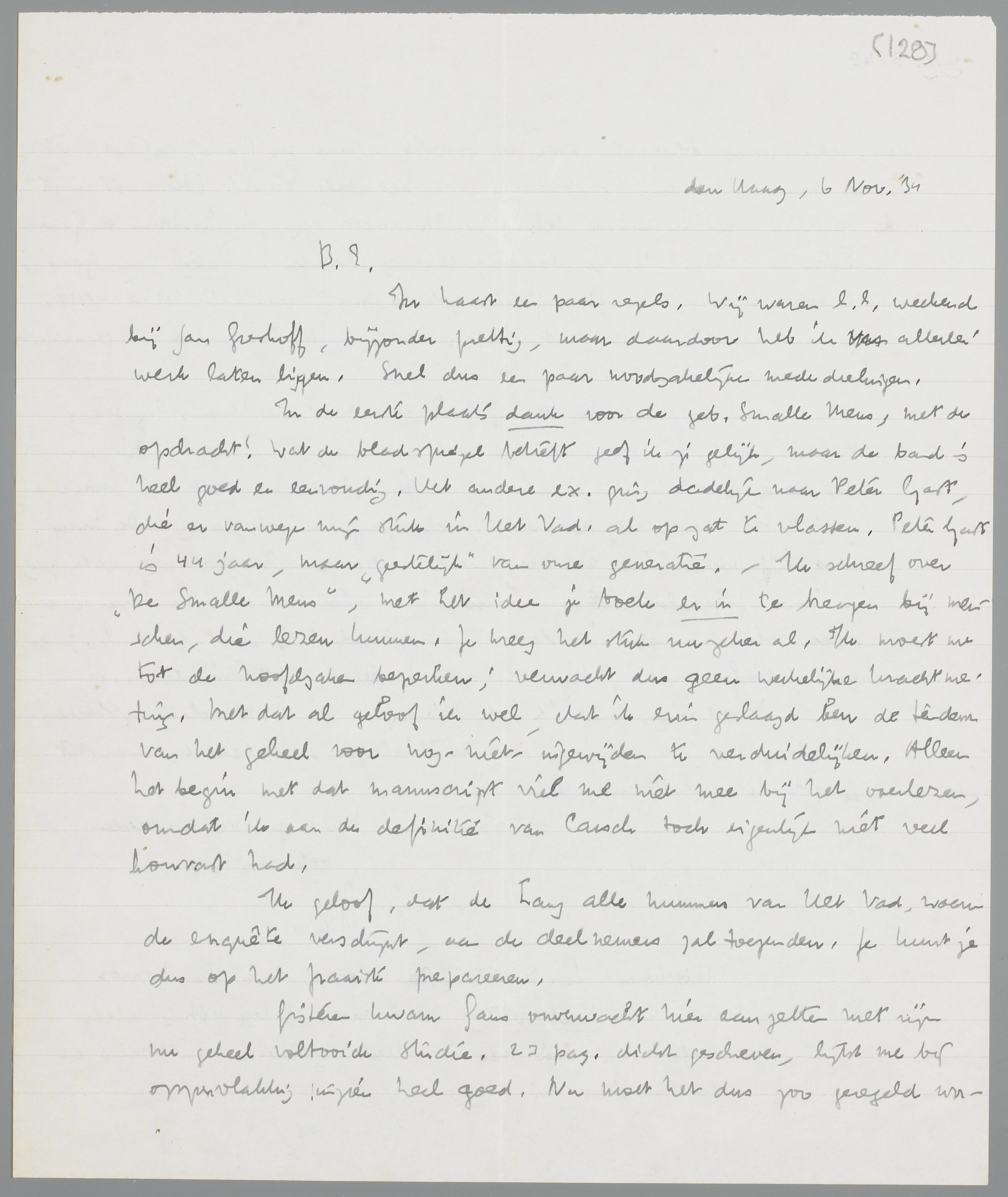 In de eerste plaats dank voor de geb. Smalle Mens, met de opdracht! Wat de bladspiegel betreft geef ik je gelijk, maar de band is heel goed en eenvoudig. Het andere ex. ging dadelijk naar Peter Gast, die er vanwege mijn stuk in Het Vad. al op zat te vlassen. Peter Gast is 44 jaar, maar ‘geestelijk’ van onze generatie. - Ik schreef over De Smalle Mens, met het idee je boek er in te brengen bij menschen, die lezen kunnen. Je kreeg het stuk nu zeker al. Ik moest me tot de hoofdzaken beperken; verwacht dus geen werkelijke krachtmeting. Met dat al geloof ik wel, dat ik erin geslaagd ben de tendenz van het geheel voor nog-niet-ingewijden te verduidelijken. Alleen het begin met dat manuscript viel me niet mee bij het overlezen, omdat ik aan de definitie van Carsch toch eigenlijk niet veel houvast had.