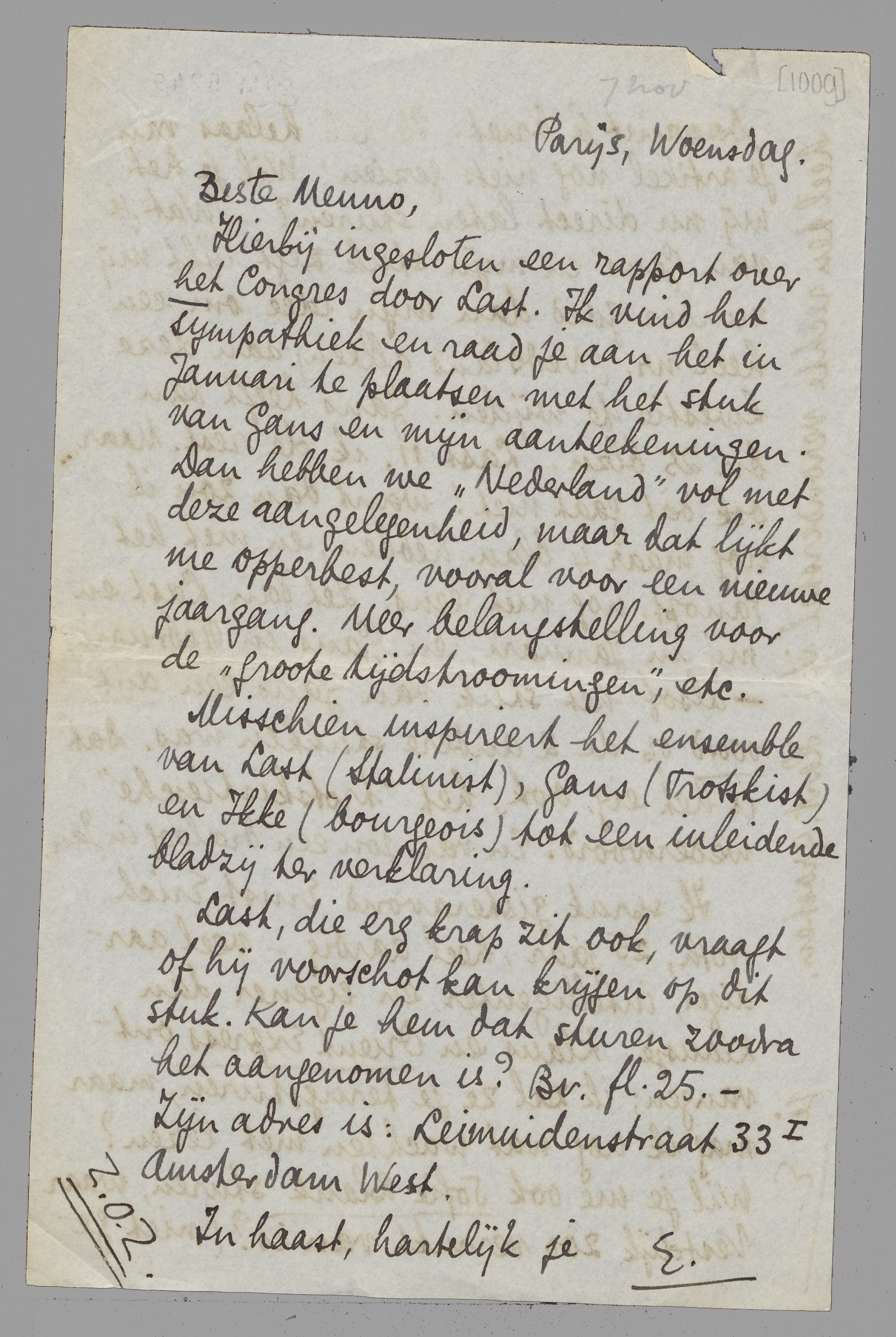 Hierbij ingesloten een rapport over het Congres door Last. Ik vind het sympathiek en raad je aan het in Januari te plaatsen met het stuk van Gans en mijn aanteekeningen. Dan hebben we ‘Nederland’ vol met deze aangelegenheid, maar dat lijkt me opperbest, vooral voor een nieuwe jaargang. Meer belangstelling voor de ‘groote tijdstroomingen’, etc.