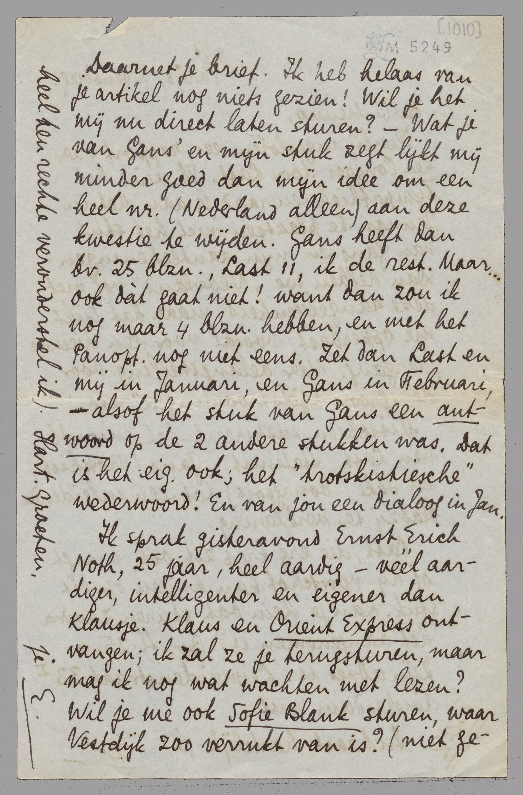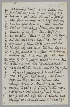 Ik sprak gisteravond Ernst Erich Noth, 25 jaar, heel aardig - véél aardiger, intelligenter en eigener dan Klausje. Klaus en Orient Express ontvangen; ik zal ze je terugsturen, maar mag ik nog wat wachten met lezen? Wil je me ook Sofie Blank sturen, waar Vestdijk zoo verrukt van is? (niet geheel ten rechte veronderstel ik) Hart. groeten,
