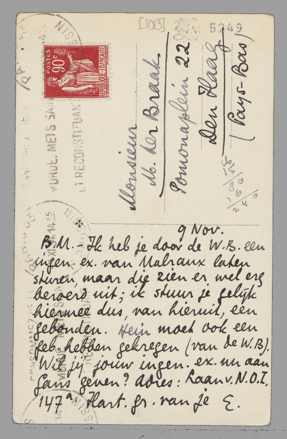 - Ik heb je door de W.B. een ingen. ex. van Malraux laten sturen, maar die zien er wel erg beroerd uit; ik stuur je gelijk hiermee dus, van hieruit, een gebonden. Hein moet ook een geb. hebben gekregen (van de W.B.) Wil jij jouw ingen. ex. nu aan Gans geven? Adres: Laan v.N.O.I. 147a. Hart. gr. van je