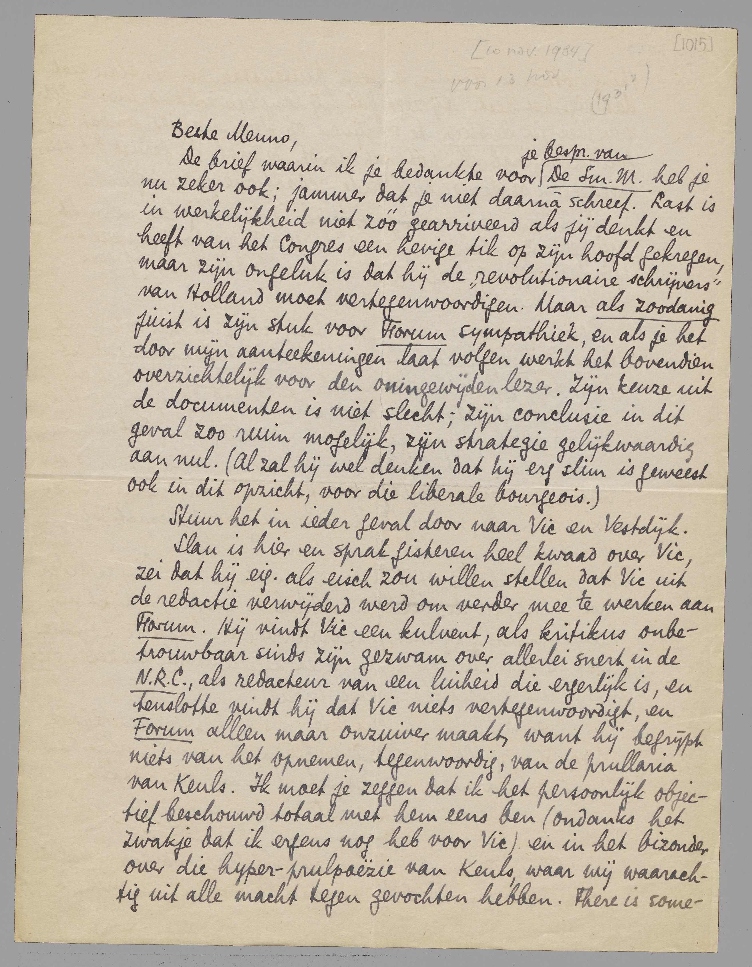 De brief waarin ik je bedankte voor je bespr. van De Sm. M. heb je nu zeker ook; jammer dat je niet daarnà schreef. Last is in werkelijkheid niet zóó gearriveerd als jij denkt en heeft van het Congres een hevige tik op zijn hoofd gekregen, maar zijn ongeluk is dat hij de ‘revolutionaire schrijvers’ van Holland moet vertegenwoordigen. Maar als zoodanig juist is zijn stuk voor Forum sympathiek, en als je het door mijn aanteekeningen laat volgen werkt het bovendien overzichtelijk voor den oningewijden lezer. Zijn keuze uit de documenten is niet slecht; zijn conclusie in dit geval zoo ruim mogelijk, zijn strategie gelijkwaardig aan nul. (al zal hij wel denken dat hij erg slim is geweest ook in dit opzicht, voor die liberale bourgeois.)