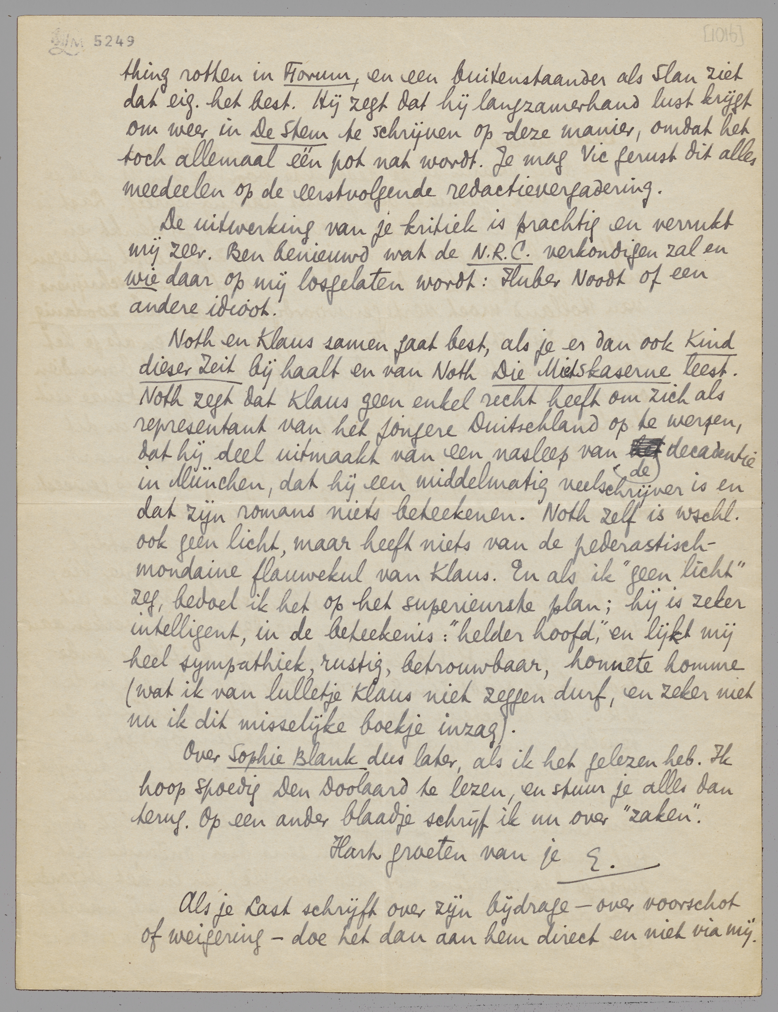 Noth en Klaus samen gaat best, als je er dan ook Kind dieser Zeit bij haalt en van Noth Die Mietskaserne leest. Noth zegt dat Klaus geen enkel recht heeft om zich als representant van het jongere Duitschland op te werpen, dat hij deel uitmaakt van een nasleep van de decadentie in München, dat hij een middelmatig veelschrijver is en dat zijn romans niets beteekenen. Noth zelf is wschl. ook geen licht, maar heeft niets van de pederastisch-mondaine flauwekul van Klaus. En als ik ‘geen licht’ zeg, bedoel ik het op het superieurste plan; hij is zeker intelligent, in de beteekenis: ‘helder hoofd’, en lijkt mij heel sympathiek, rustig, betrouwbaar, honnête homme (wat ik van lulletje Klaus niet zeggen durf, en zeker niet nu ik dit misselijke boekje inzag).