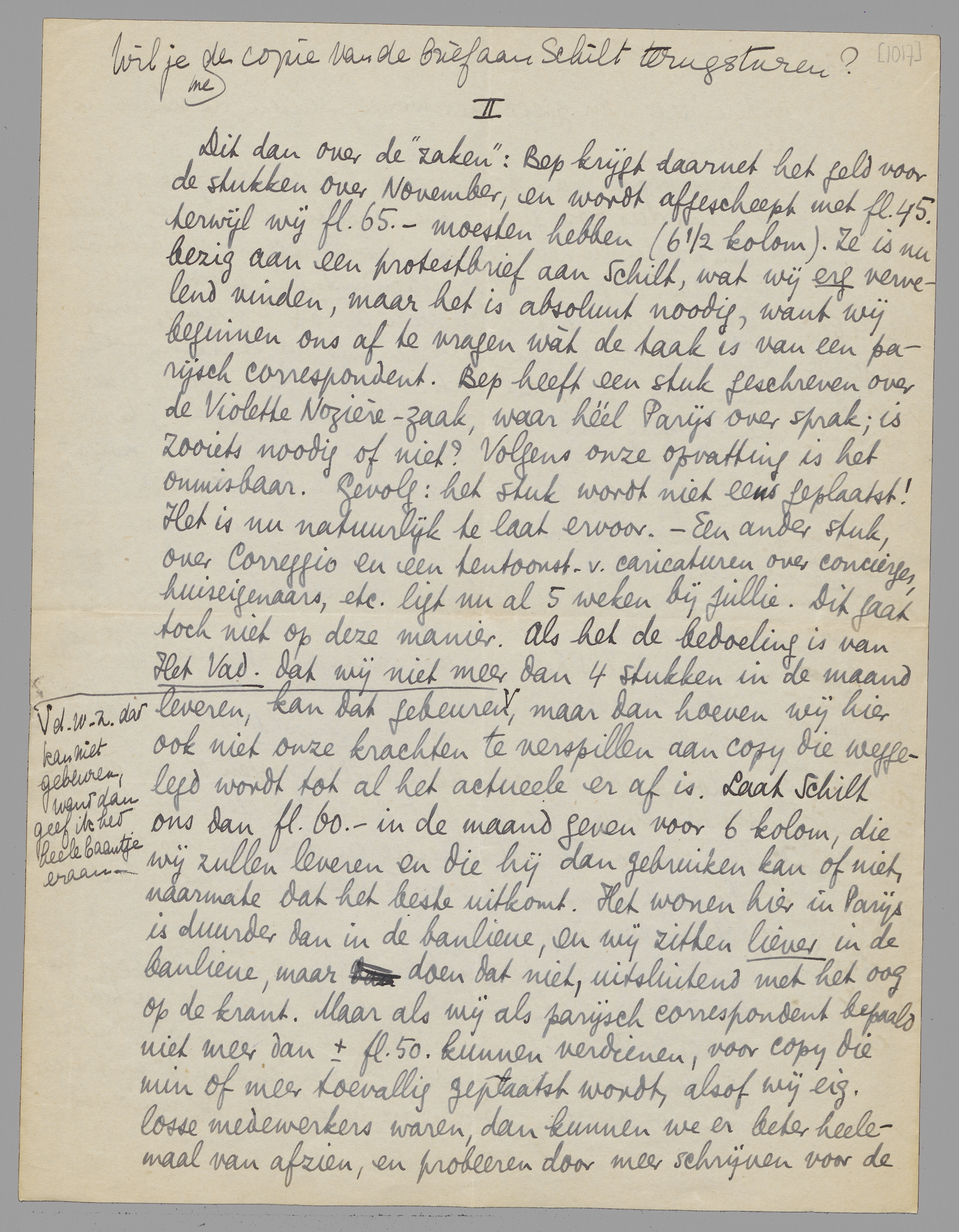 Dit dan over de ‘zaken’: Bep krijgt daarnet het geld voor de stukken over November, en wordt afgescheept met fl. 45. - terwijl wij fl. 65. - moesten hebben (6½ kolom). Ze is nu bezig aan een protestbrief aan Schilt, wat wij erg vervelend vinden, maar het is absoluut noodig, want wij beginnen ons af te vragen wàt de taak is van een parijsch correspondent. Bep heeft een stuk geschreven over de Violette Nozière-zaak, waar héél Parijs over sprak; is zooiets noodig of niet? Volgens onze opvatting is het onmisbaar. Gevolg: het stuk wordt niet eens geplaatst! Het is nu natuurlijk te laat ervoor. - Een ander stuk, over Correggio en een tentoonst. v. caricaturen over concierges, huiseigenaars, etc. ligt nu al 5 weken bij jullie. Dit gaat toch niet op deze manier. Als het de bedoeling is van Het Vad. dat wij niet meer dan 4 stukken in de maand leveren, kan dat gebeuren*, maar dan hoeven wij hier ook niet onze krachten te verspillen aan copy die weggelegd wordt tot al het actueele er af is. Laat Schilt ons dan fl. 60. - in de maand geven voor 6 kolom, die wij zullen leveren en die hij dan gebruiken kan of niet, naarmate dat het beste uitkomt. Het wonen hier in Parijs is duurder dan in de banlieue, en wij zitten liever in de banlieue, maar doen dat niet, uitsluitend met het oog op de krant. Maar als wij als parijsch correspondent bepaald niet meer dan ± fl. 50. - kunnen verdienen, voor copy die min of meer toevallig geplaatst wordt, alsof wij eig. losse medewerkers waren, dan kunnen we er beter heelemaal van afzien, en probeeren door meer schrijven voor de andere bladen en goedkooper wonen buiten, de schade in te halen.