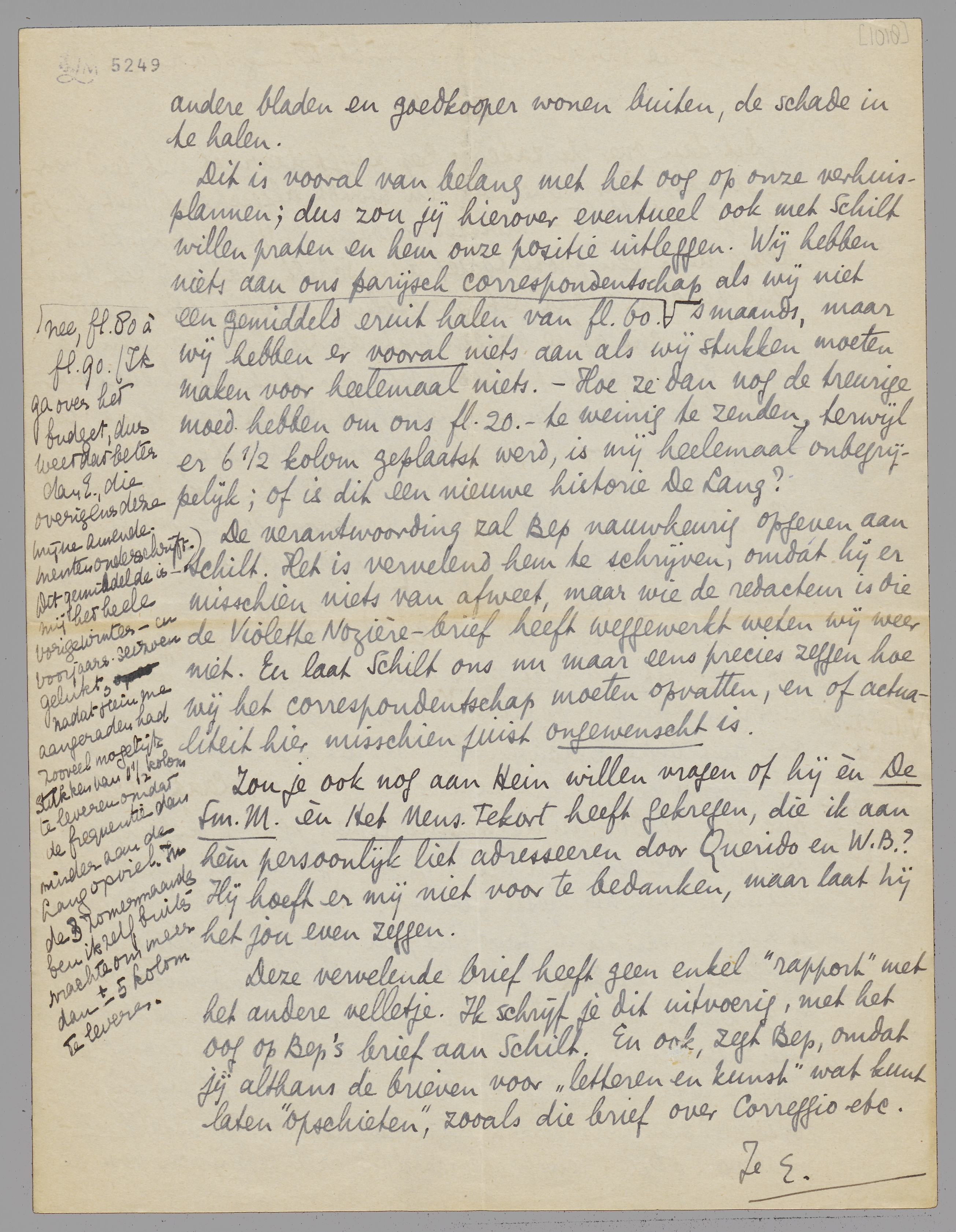 De verantwoording zal Bep nauwkeurig opgeven aan Schilt. Het is vervelend hem te schrijven, omdat hij er misschien niets van afweet, maar wie de redacteur is die de Violette Nozièrebrief heeft weggewerkt weten wij weer niet. En laat Schilt ons nu maar eens precies zeggen hoe wij het correspondentschap moeten opvatten, en of actualiteit hier misschien juist ongewenscht is.