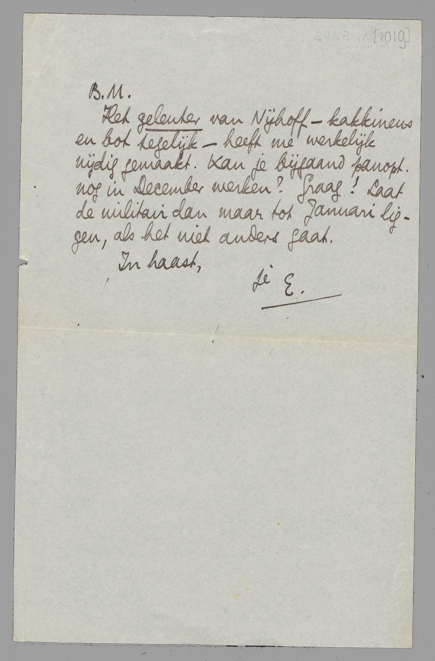 Het geleuter van Nijhoff - kakkineus en bot tegelijk - heeft me werkelijk nijdig gemaakt. Kan je bijgaand panopt. nog in December werken? Graag! Laat de militair maar tot Januari liggen, als het niet anders gaat.