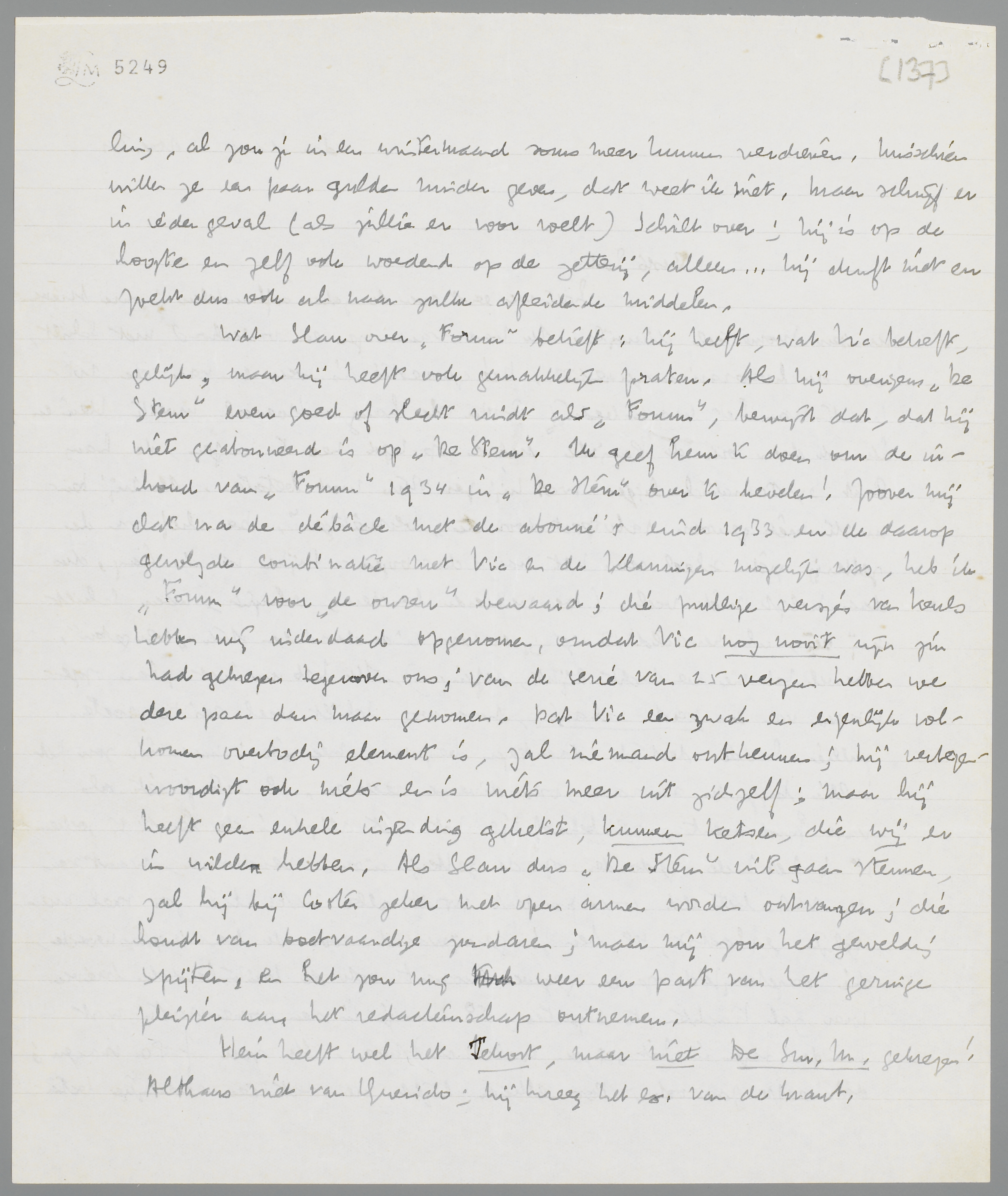 Wat Slau over Forum betreft: hij heeft, wat Vic betreft, gelijk, maar hij heeft ook gemakkelijk praten. Als hij overigens De Stem even goed of slecht vindt als Forum, bewijst dat, dat hij niet geabonneerd is op De Stem. Ik geef hem te doen om de inhoud van Forum 1934 in De Stem over te hevelen! Zoover mij dat na de débacle met de abonné's eind 1933 en de daarop gevolgde combinatie met Vic en de Vlamingen mogelijk was, heb ik Forum voor ‘de onzen’ bewaard; die prullige versjes van Keuls hebben wij inderdaad opgenomen, omdat Vic nog nooit zijn zin had gekregen tegenover ons; van de serie van 25 verzen hebben we deze paar dan maar genomen. Dat Vic een zwak en eigenlijk volkomen overbodig element is, zal niemand ontkennen; hij vertegenwoordigt ook niets en is niets meer uit zichzelf; maar hij heeft geen enkele inzending geketst, kunnen ketsen, die wij er in wilden hebben. Als Slau dus De Stem wil gaan steunen, zal hij bij Coster zeker met open armen worden ontvangen; die houdt van boetvaardige zondaren; maar mij zou het geweldig spijten, en het zou mij weer een part van het geringe pleizier aan het redacteurschap ontnemen.