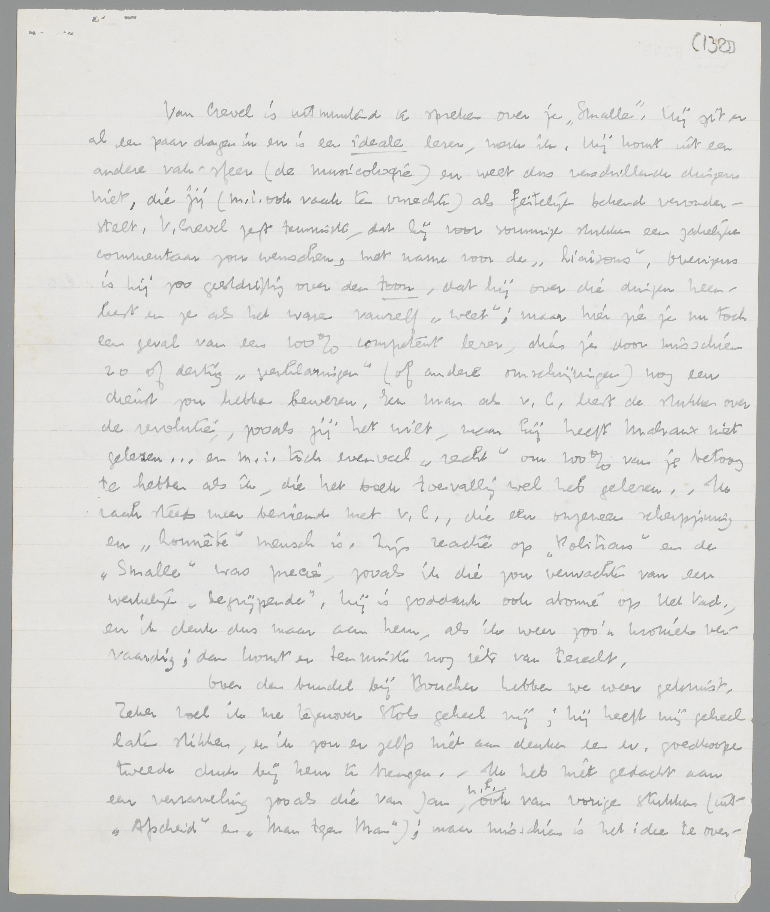 Van Crevel is uitmuntend te spreken over je Smalle. Hij zit er al een paar dagen in en is een ideale lezer, merk ik. Hij komt uit een andere vak-sfeer (de musicologie) en weet dus verschillende dingen niet, die jij (m.i. ook vaak ten onrechte) als feitelijk bekend veronderstelt. V. Crevel zegt tenminste, dat hij voor sommige stukken een zakelijke commentaar zou wenschen, met name voor de Liaisons. Overigens is hij zoo geestdriftig over den toon, dat hij over die dingen heenleest en ze als het ware vanzelf ‘weet’; maar hier zie je nu toch een geval van een 100% competent lezer, die je door misschien 20 of dertig ‘verklaringen’ (of andere omschrijvingen) nog een dienst zou hebben bewezen. Een man als v.C. leest de stukken over de revolutie, zooals jij het wilt, maar hij heeft Malraux niet gelezen... en m.i. toch evenveel ‘recht’ om 100% van je betoog te hebben als ik, die het boek toevallig wel heb gelezen. - Ik raak steeds meer bevriend met v.C., die een ongemeen scherpzinnig en ‘honnête’ mensch is. Zijn reactie op Politicus en de Smalle was precies, zooals ik die zou verwachten van een werkelijk ‘begrijpende’. Hij is goddank ook abonné op Het Vad., en ik denk dus maar aan hem, als ik weer zoo'n kroniek vervaardig; dan komt er tenminste nog iets van terecht.