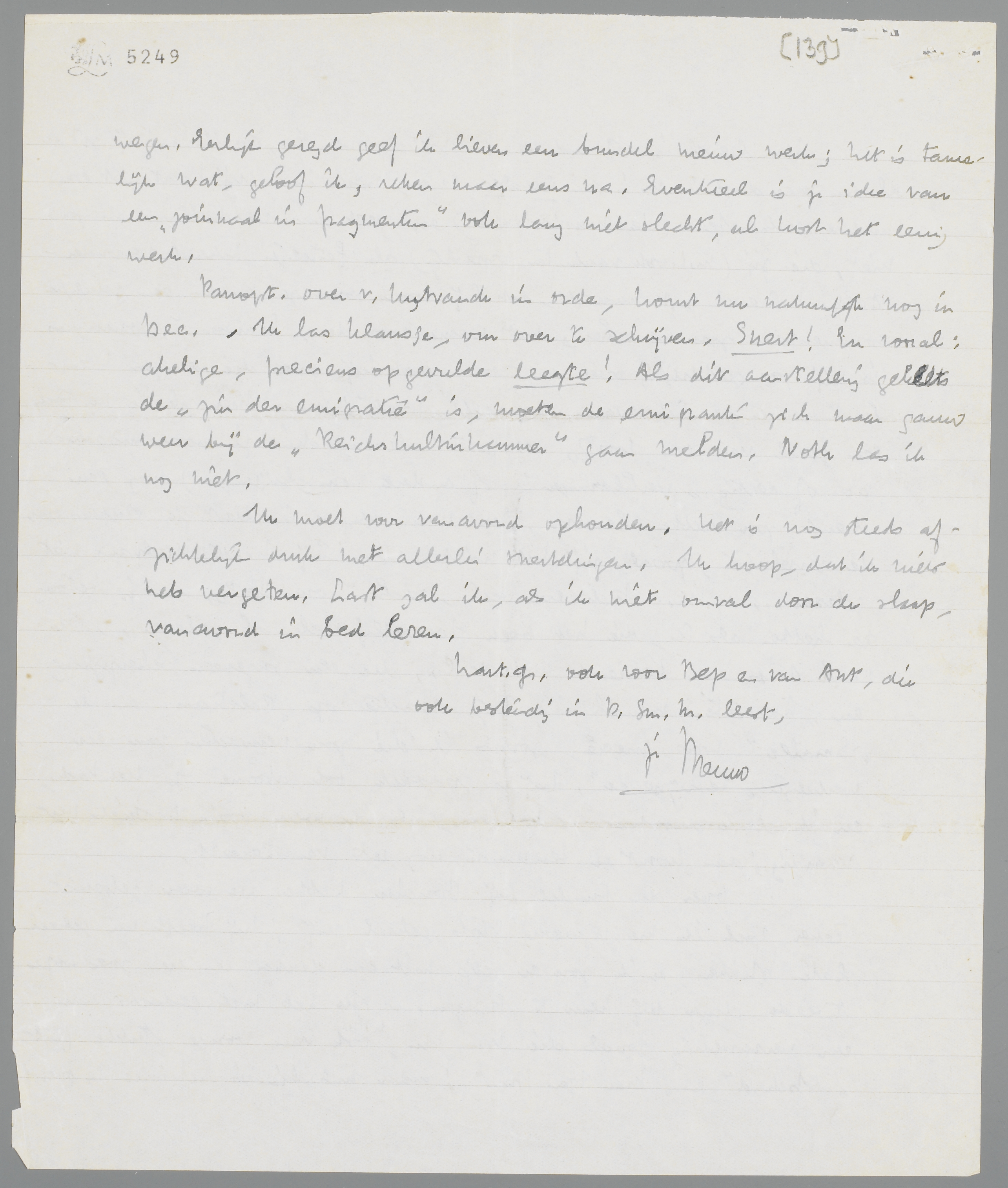 Panopt. over v. Uijtvanck in orde, komt nu natuurlijk nog in Dec. - Ik las Klausje, om over te schrijven. Snert! En vooral: akelige, precieus opgevulde leegte! Als dit aanstellerig geklets de ‘zin der emigratie’ is, moeten de emigranten zich maar gauw weer bij de ‘Reichskulturkammer’ gaan melden. Noth las ik nog niet.