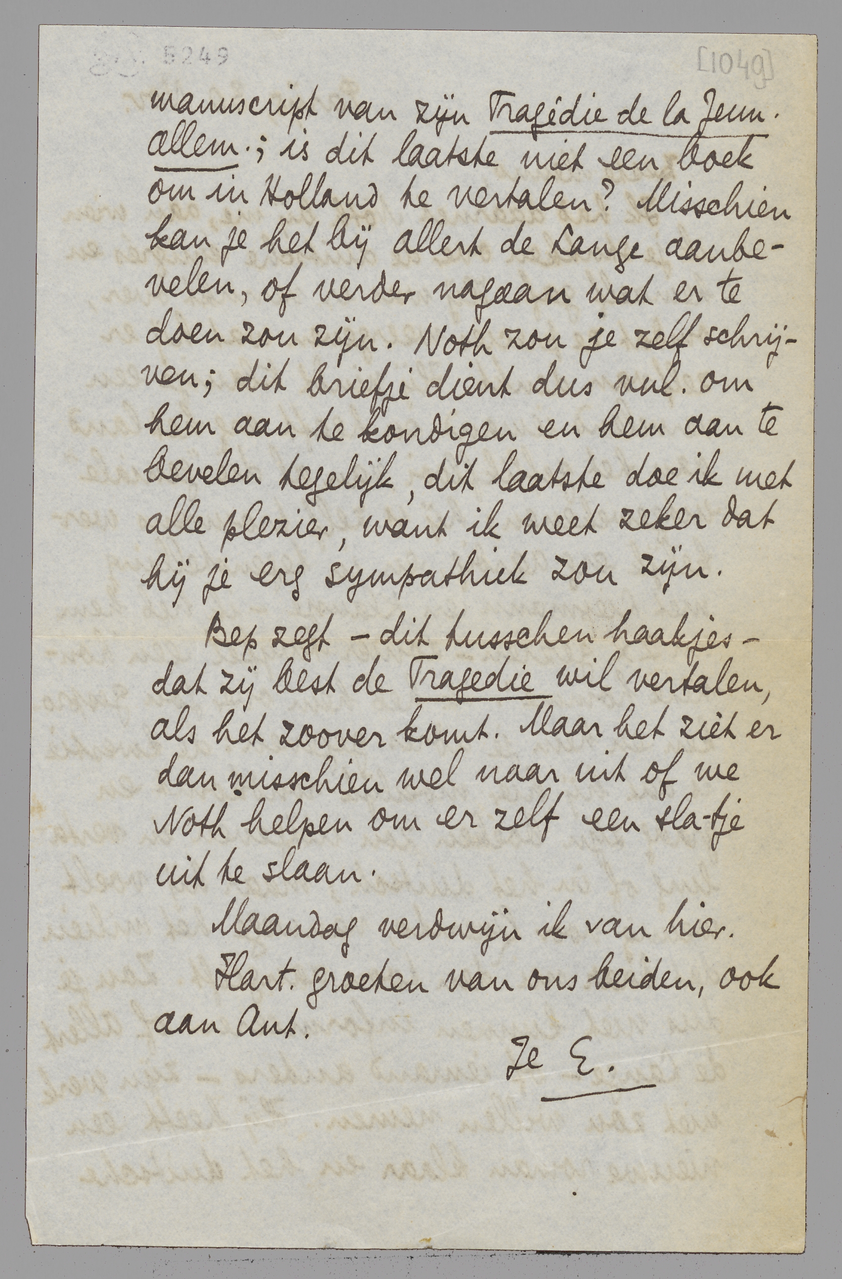 Ik had daarnet Noth bij me, aan wien ik je stukken over de Duitsche emigrés en hemzelf gaf. Hij was er verrukt over, omdat ze precies weergeven wat hij er zelf van denkt. Hij vindt Klausje een vervelend iemand en heeft erg het land aan het geflikflooi, van al die ‘geniale’ uitgewekenen; hij is zelf trouwens werkelijk erg aardig, en in tegenstelling met Liepmann en Klausje - ik heb hem nu 2 × gezien - zonder twijfel een ‘honnête homme’. Ik heb hem over jou gesproken en hem je adres gegeven: de kwestie is dat hij hier moeilijk rondkomt en graag zijn boeken zou uitgeven, in vertaling of in het duitsch; maar hij voelt weinig voor Querido, vanwege het milieu dat daar nu den toon aangeeft. Zou je dus niet kunnen informeeren of Allert de Lange - of iemand anders - zijn werk niet zou willen nemen. Hij heeft een nieuwe roman klaar en het duitsche manuscript van zijn Tragédie de la Jeun. Allem.; is dit laatste niet een boek om in Holland te vertalen? Misschien kan je het bij Allert de Lange aanbevelen, of verder nagaan wat er te doen zou zijn. Noth zou je zelf schrijven; dit briefje dient dus vnl. om hem aan te kondigen en hem aan te bevelen tegelijk, dit laatste doe ik met alle plezier, want ik weet zeker dat hij je erg sympathiek zou zijn.