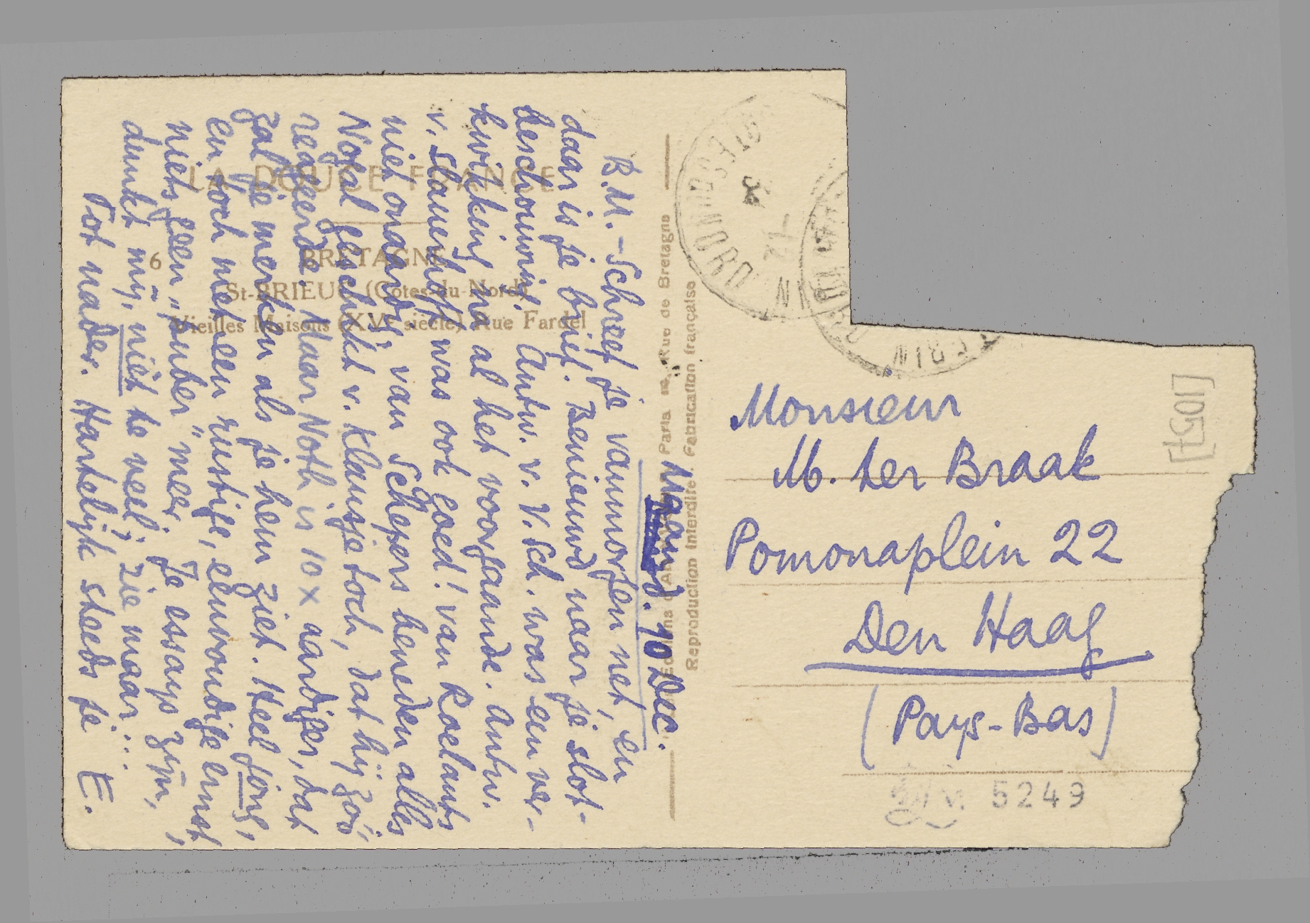 - Schreef je vanmorgen net, en daar is je brief. Benieuwd naar je slotbeschouwing. Antw. v.V. Sch. was een verkwikking na al het voorgaande. Antw. v. Slauerhoff was ook goed! van Roelants niet onaardig, van Schepers beneden alles. Nogal geschikt v. Klausje toch, dat hij zóó reageerde. Maar Noth is 10 × aardiger, dat zal je merken als je hem ziet. Heel jong, en toch met een rustige, eenvoudige ernst, niets geen ‘puber’ meer. Je essays zijn, dunkt mij, niet te veel; zie maar...