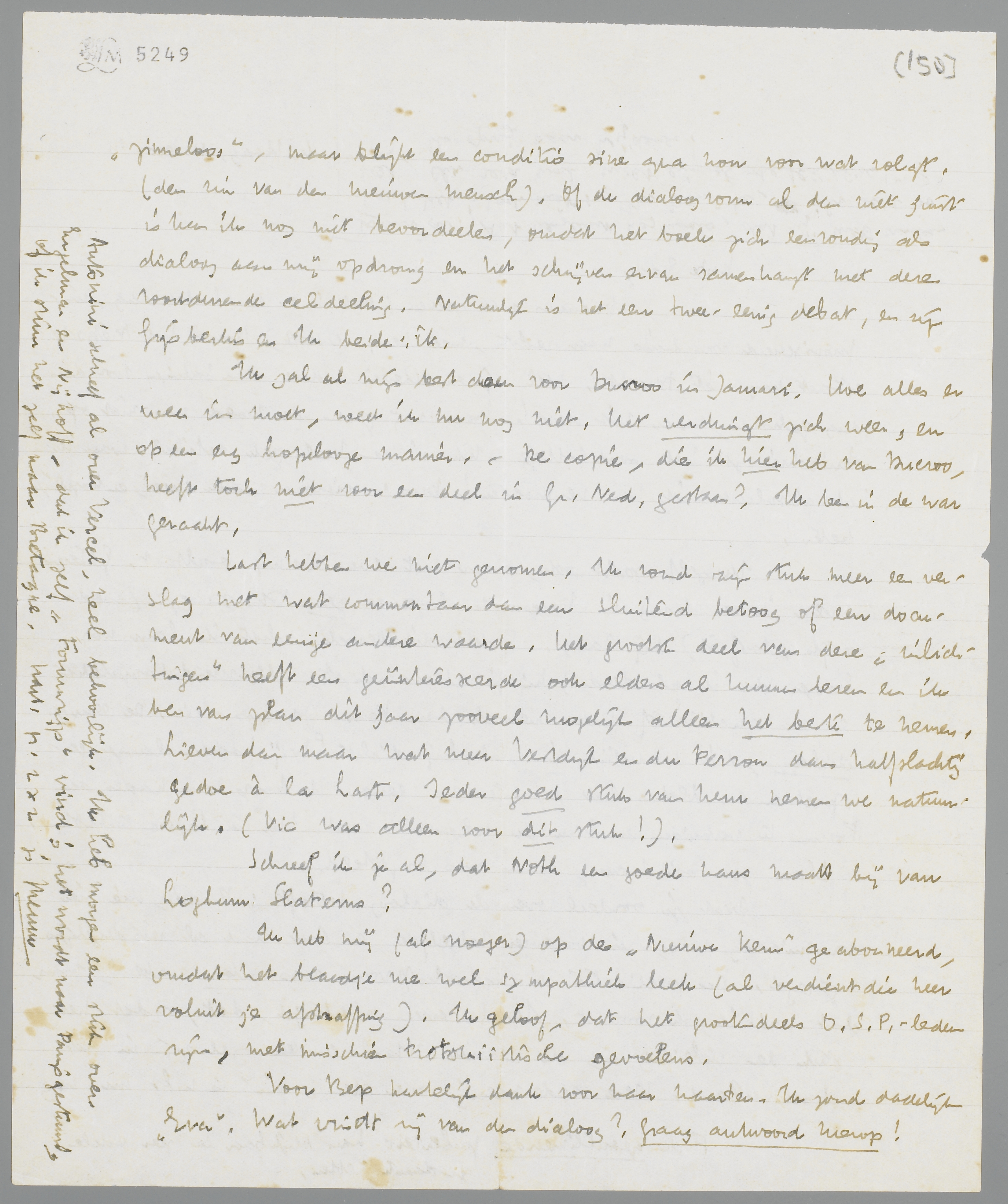 Wat je oordeel over de dialoog betreft: Rudie, die hier vanmiddag was, zei ongeveer hetzelfde, en Ant had al iets dergelijks gezegd. De publicatie in tijdschriftvorm was zeker verkeerd, maar dat wist ik ook vooruit. Ik ben ervan overtuigd, dat, omdat het stuk een inleiding is, de indruk totaal anders zal zijn in het boekverband. Deze redeneering over den ‘zin’ is n.l. nu nog ‘zinneloos’, maar blijkt een conditio sine qua non voor wat volgt. (den zin van den nieuwen mensch). Of de dialoogvorm al dan niet juist is kan ik nog niet beoordeelen, omdat het boek zich eenvoudig als dialoog aan mij opdrong en het schrijven ervan samenhangt met deze voortdurende celdeeling. Natuurlijk is het een twee-eenig debat, en zijn Gijsbertus en Ik beide: ik.