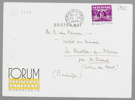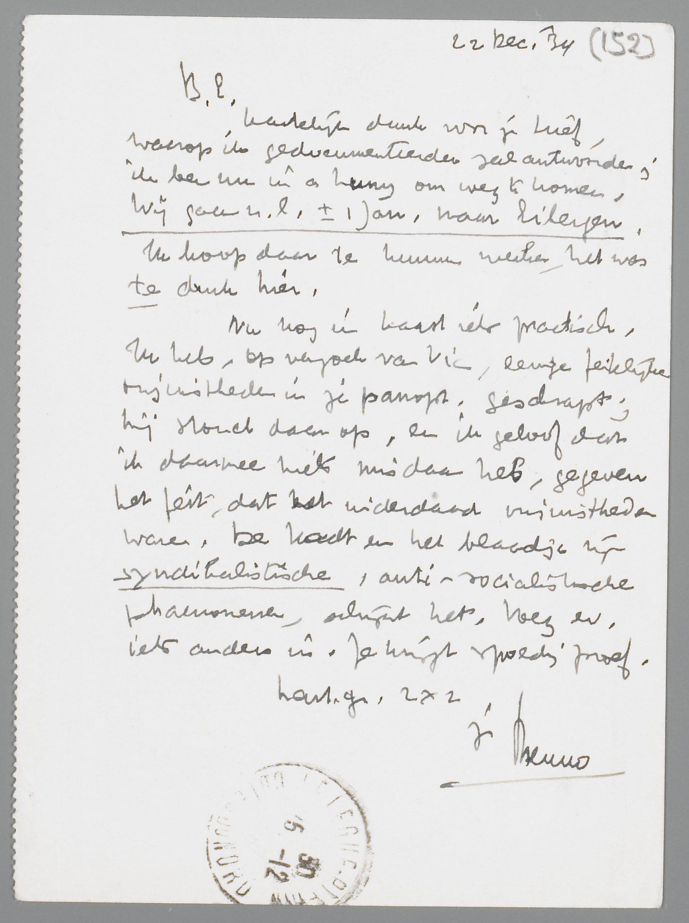 Hartelijk dank voor je brief, waarop ik gedocumenteerder zal antwoorden; ik ben nu in a hurry om weg te komen. Wij gaan n.l. ± 1 Jan. naar Eibergen. Ik hoop daar te kunnen werken, het was te druk hier.