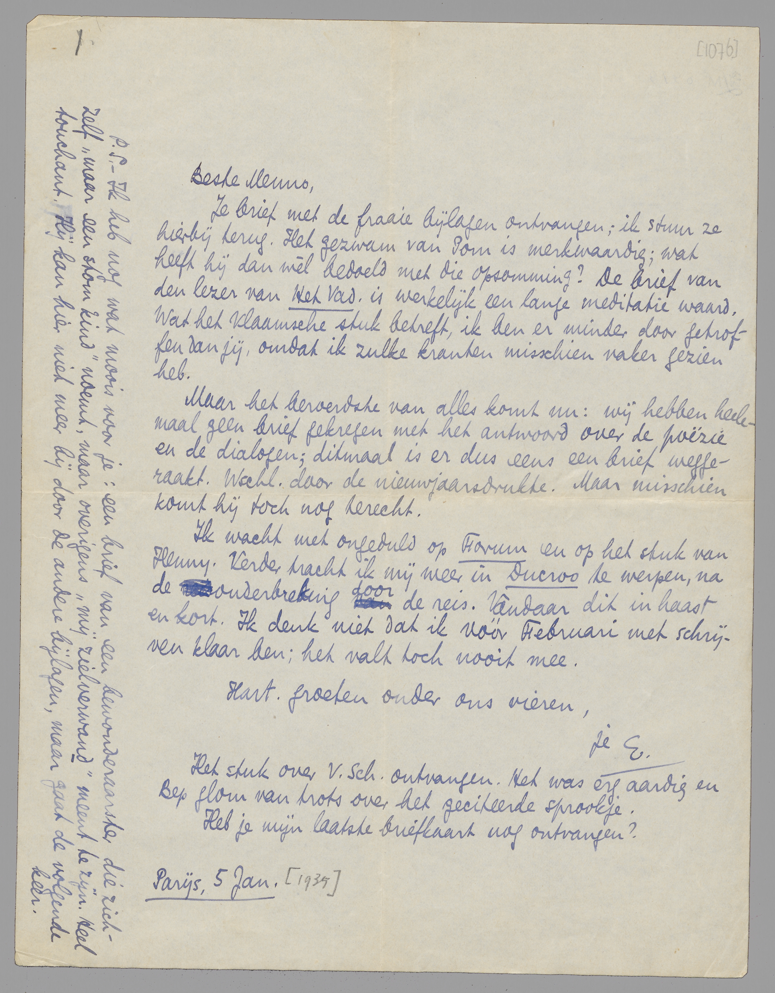Ik wacht met ongeduld op Forum en op het stuk van Henny. Verder tracht ik mij weer in Ducroo te werpen, na de onderbreking door de reis. Vandaar dit in haast en kort. Ik denk niet dat ik vóór Februari met schrijven klaar ben; het valt toch nooit mee.