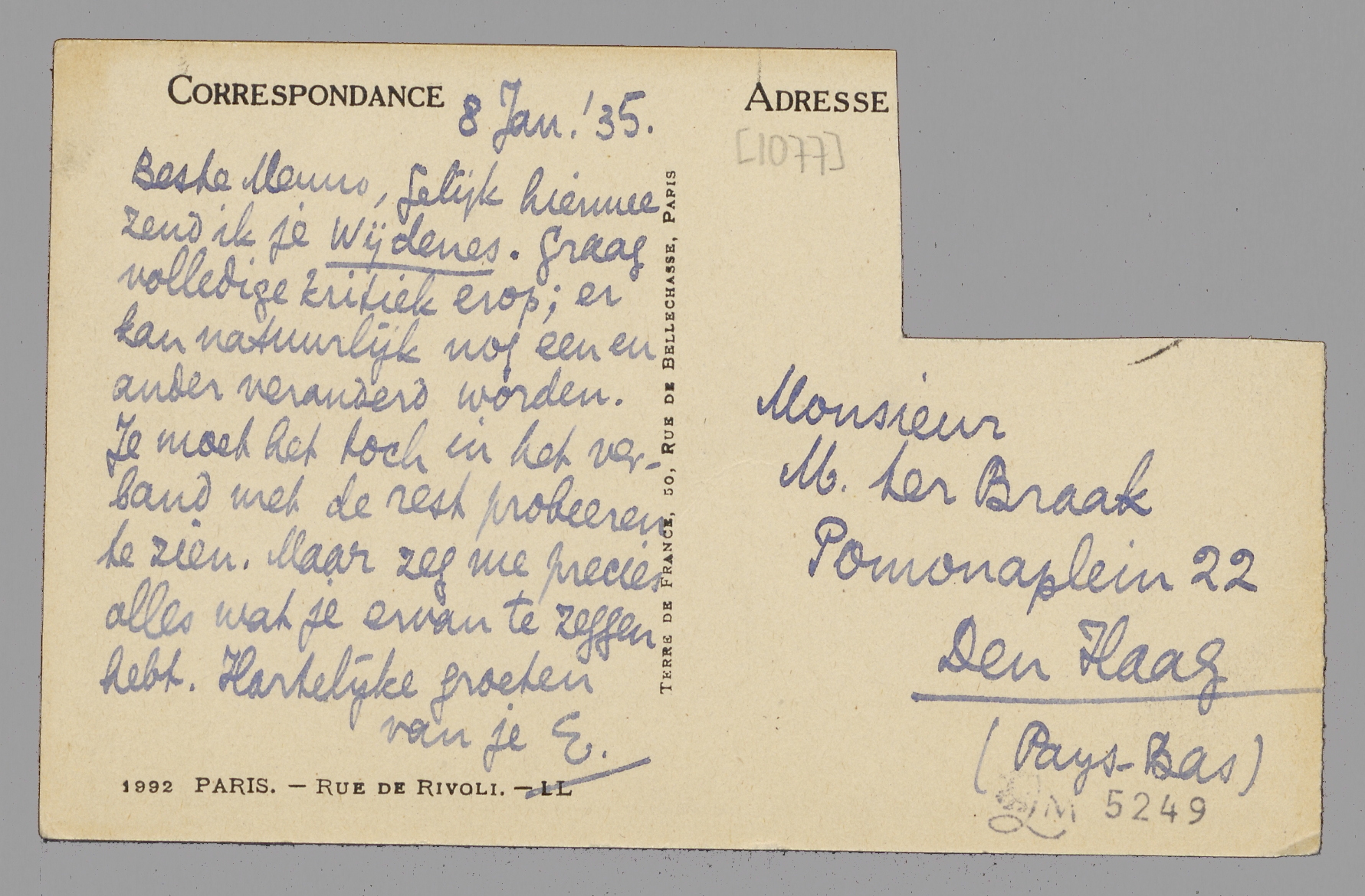 Gelijk hiermee zend ik je Wijdenes. Graag volledige kritiek erop; er kan natuurlijk nog een en ander veranderd worden. Je moet het toch in het verband met de rest probeeren te zien. Maar zeg me precies alles wat je ervan te zeggen hebt. Hartelijke groeten