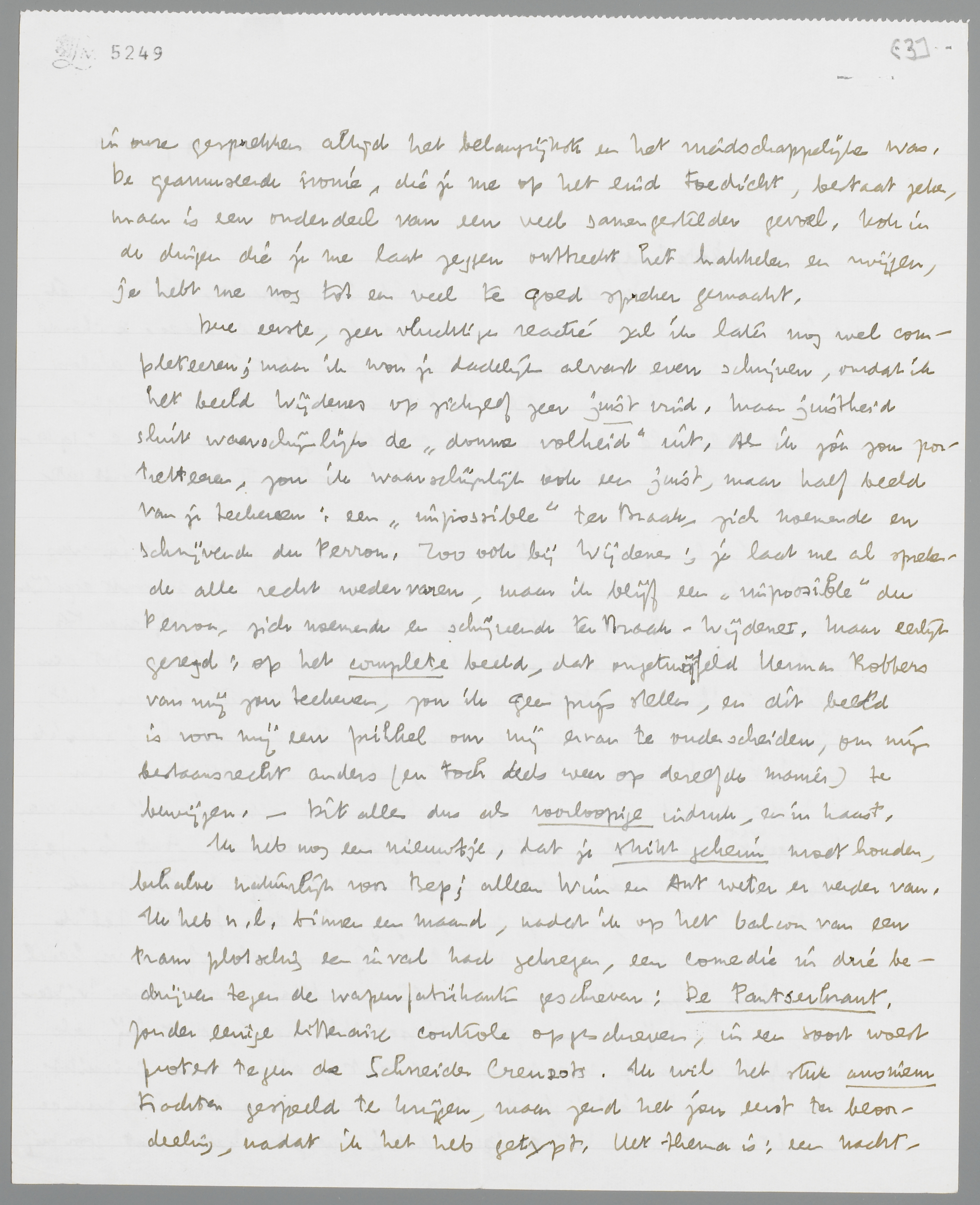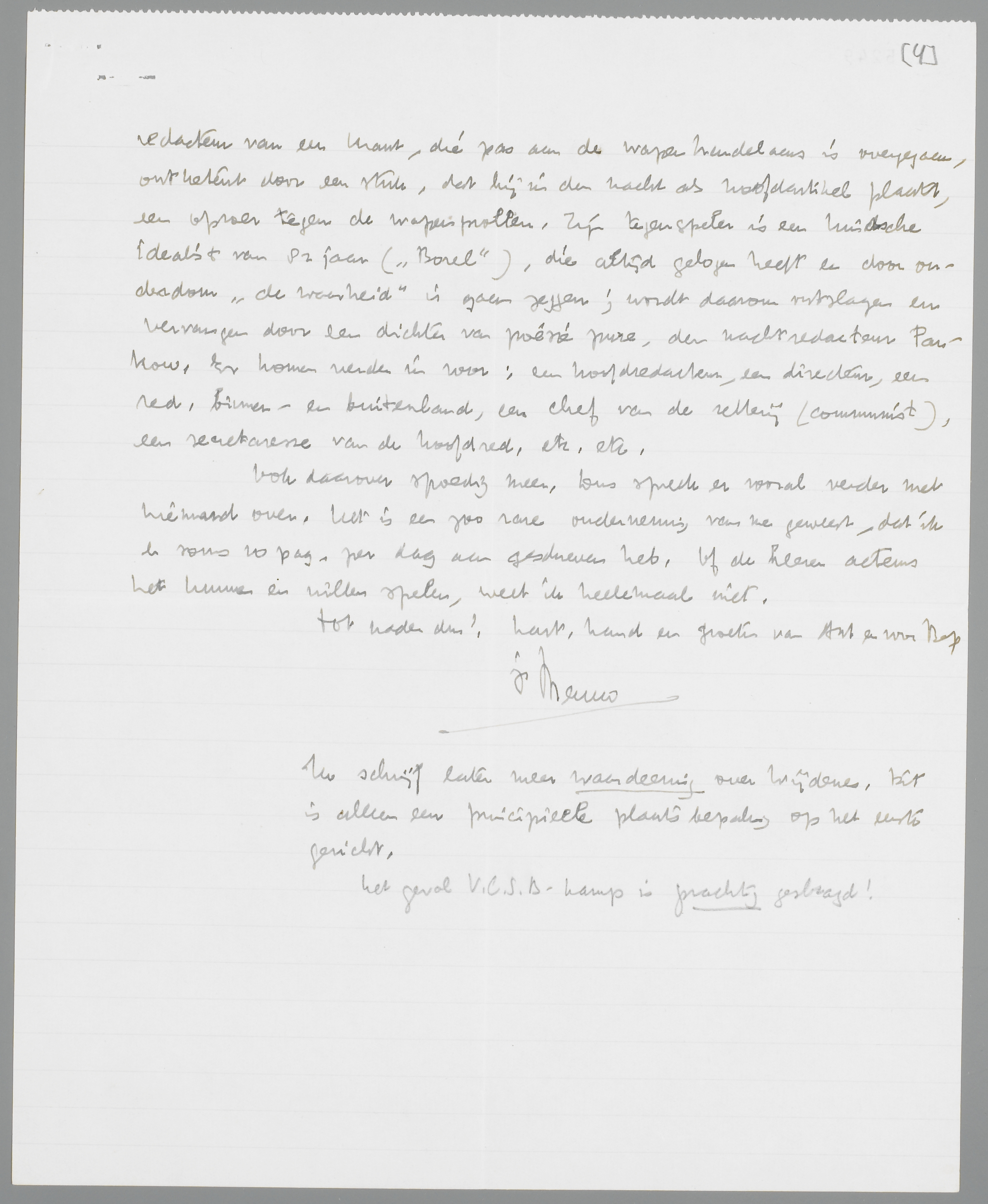Ik heb nog een nieuwtje, dat je strikt geheim moet houden, behalve natuurlijk voor Bep; alleen Wim en Ant weten er verder van. Ik heb n.l. binnen een maand, nadat ik op het balcon van een tram plotseling een inval had gekregen, een comedie in drie bedrijven tegen de wapenfabrikanten geschreven; De Pantserkrant. Zonder eenige litteraire contrôle opgeschreven, in een soort woest protest tegen de Schneider Creuzots. Ik wil het stuk anoniem trachten gespeeld te krijgen, maar zend het jou eerst ter beoordeeling, nadat ik het heb getypt. Het thema is: een nachtredacteur van een krant, die pas aan de wapenhandelaars is overgegaan, ontketent door een stuk, dat hij in de nacht als hoofdartikel plaatst, een oproer tegen de wapenprollen. Zijn tegenspeler is een kindsche idealist van 82 jaar (‘Borel’), die altijd gelogen heeft en door ouderdom ‘de waarheid’ is gaan zeggen; wordt daarom ontslagen en vervangen door een dichter van poésie pure, den nachtredacteur Pankow. Er komen verder in voor: een hoofdredacteur, een directeur, een red. binnen- en buitenland, een chef van de zetterij (communist), een secretaresse van de hoofdred. etc. etc.