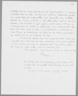 Deze eerste, zeer vluchtige reactie zal ik later nog wel completeeren; maar ik wou je dadelijk alvast even schrijven, omdat ik het beeld Wijdenes op zichzelf zeer juist vind, maar juistheid sluit waarschijnlijk de ‘domme volheid’ uit. Als ik jou zou portretteeren, zou ik waarschijnlijk ook een juist, maar half beeld van je teekenen: een ‘impossible’ ter Braak, zich noemende en schrijvende du Perron. Zoo ook bij Wijdenes; je laat me al sprekende alle recht wedervaren, maar ik blijf een ‘impossible’ du Perron zich noemende en schrijvende ter Braak-Wijdenes. Maar eerlijk gezegd: op het complete beeld, dat ongetwijfeld Herman Robbers van mij zou teekenen, zou ik geen prijs stellen, en dit beeld is voor mij een prikkel om mij ervan te onderscheiden, om mijn bestaansrecht anders (en toch deels weer op dezelfde manier) te bewijzen. - Dit alles dus als voorloopige indruk, en in haast.