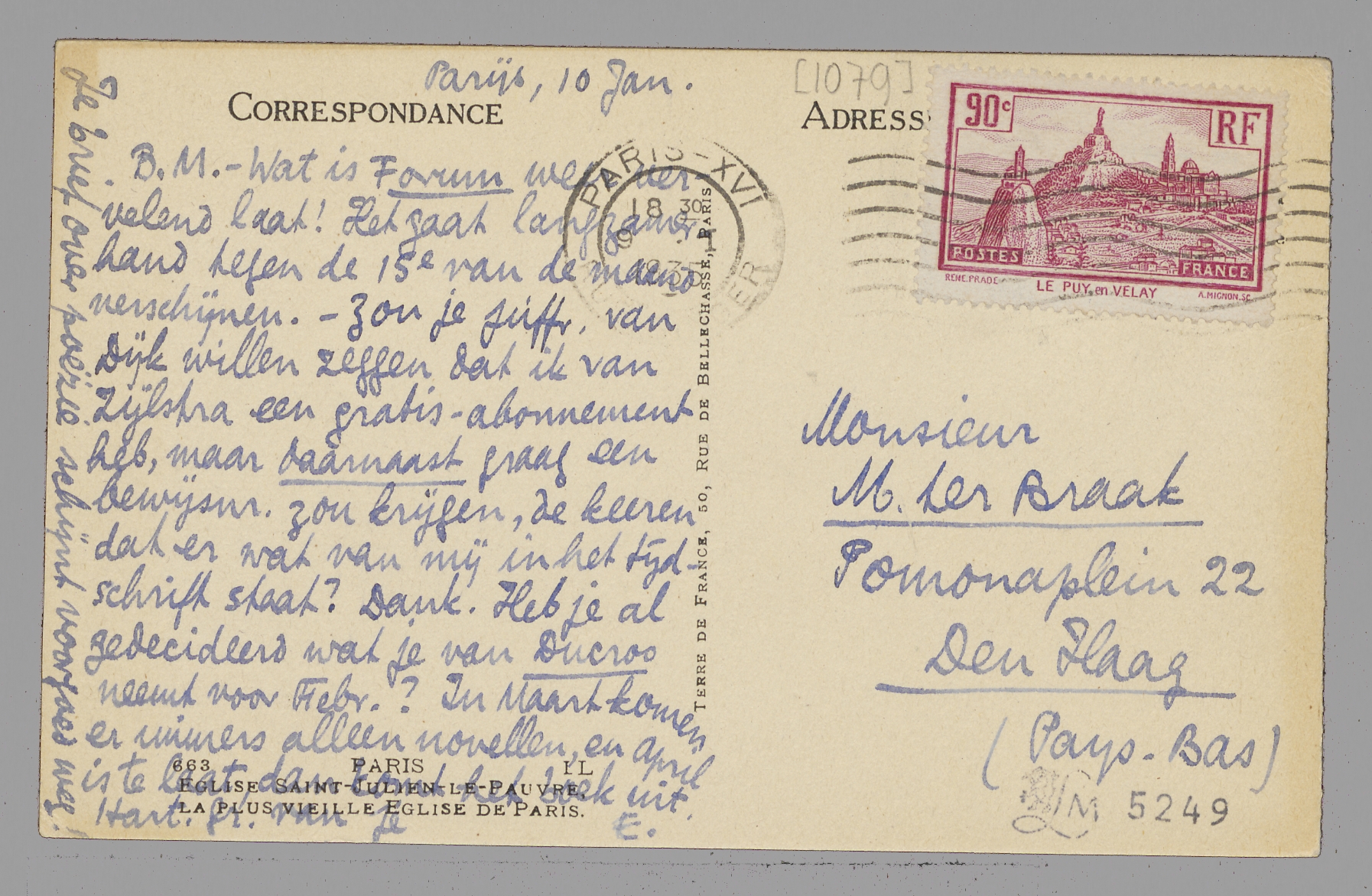 - Wat is Forum weer vervelend laat! Het gaat langzamerhand tegen de 15e van de maand verschijnen. - Zou je juffr. van Dijk willen zeggen dat ik van Zijlstra een gratis-abonnement heb, maar daarnaast graag een bewijsnr. zou krijgen? de keeren dat er wat van mij in het tijdschrift staat? Dank. Heb je al gedecideerd wat je van Ducroo neemt voor Febr.? In Maart komen er immers alleen novellen, en April is te laat dan komt het boek uit.