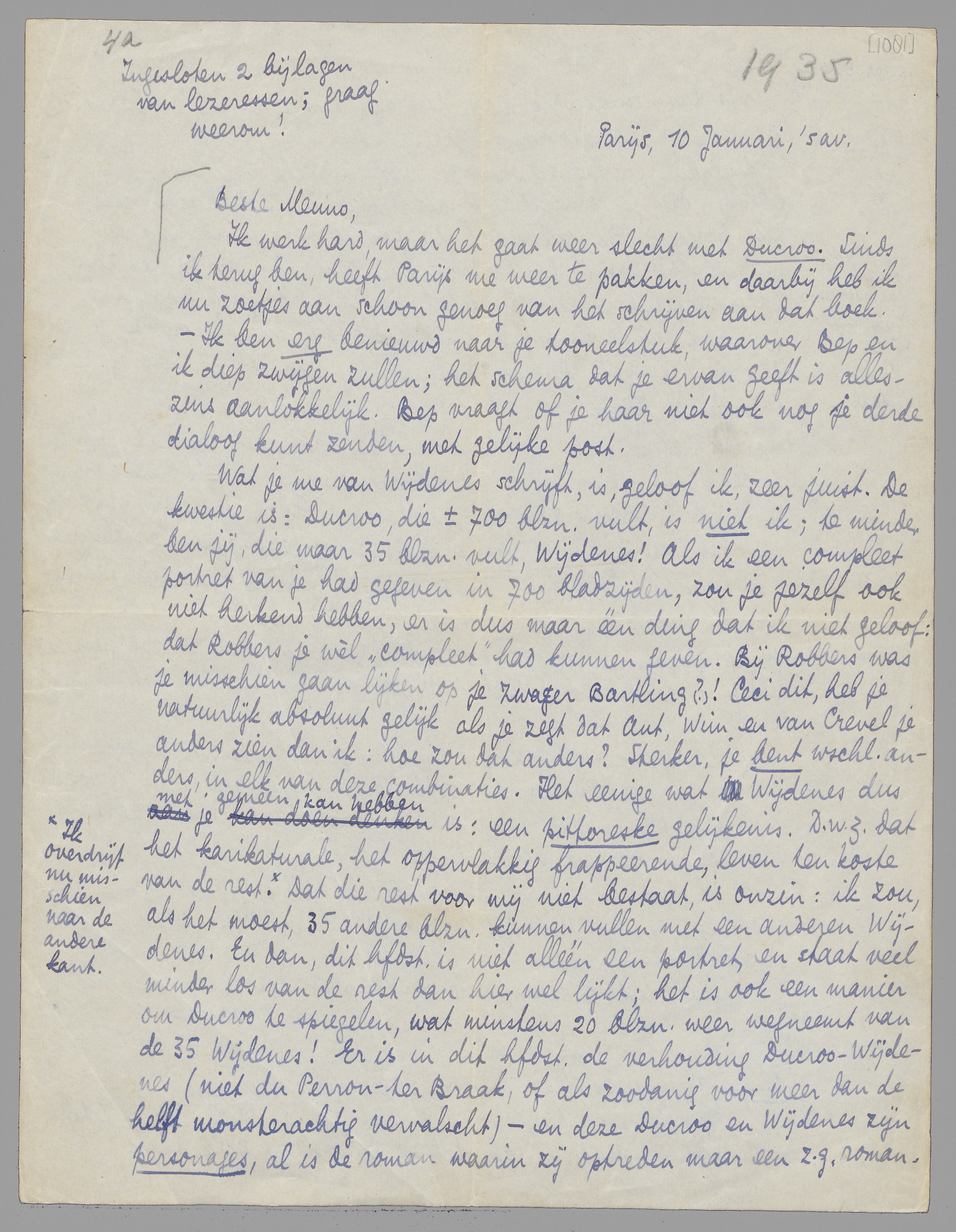Wat je me van Wijdenes schrijft, is, geloof ik, zeer juist. De kwestie is: Ducroo, die ± 700 blzn. vult, is niet ik; te minder ben jij, die maar 35 blzn. vult, Wijdenes! Als ik een compleet portret van je had gegeven in 700 bladzijden, zou je jezelf ook niet herkend hebben, er is dus maar één ding dat ik niet geloof: dat Robbers je wèl ‘compleet’ had kunnen geven. Bij Robbers was je misschien gaan lijken op je zwager Bartling(?)! Ceci dit, heb je natuurlijk absoluut gelijk als je zegt dat Ant, Wim en van Crevel je anders zien dan ik: hoe zou dat anders? Sterker, je bent wschl. anders, in elk van deze combinaties. Het eenige wat Wijdenes dus met je gemeen kan hebben is: een pittoreske gelijkenis. D.w.z. dat het karikaturale, het oppervlakkig frappeerende, leven ten koste van de rest. [Ik overdrijf nu misschien naar de andere kant.] Dat die rest voor mij niet bestaat, is onzin: ik zou, als het moest, 35 andere blzn. kunnen vullen met een anderen Wijdenes. En dan, dit hfdst. is niet alléén een portret en staat veel minder los van de rest dan hier wel lijkt; het is ook een manier om Ducroo te spiegelen, wat minstens 20 blzn. weer wegneemt van de 35 Wijdenes! Er is in dit hfdst. de verhouding Ducroo-Wijdenes (niet du Perron-ter Braak, of als zoodanig voor meer dan de helft monsterachtig vervalscht) - en deze Ducroo en Wijdenes zijn personages, al is de roman waarin zij optreden maar een z.g. roman. Er is dus een andere kant, dan die van je ‘portret’ te beoordeelen: hoe is het hfdst. als roman-fragment?