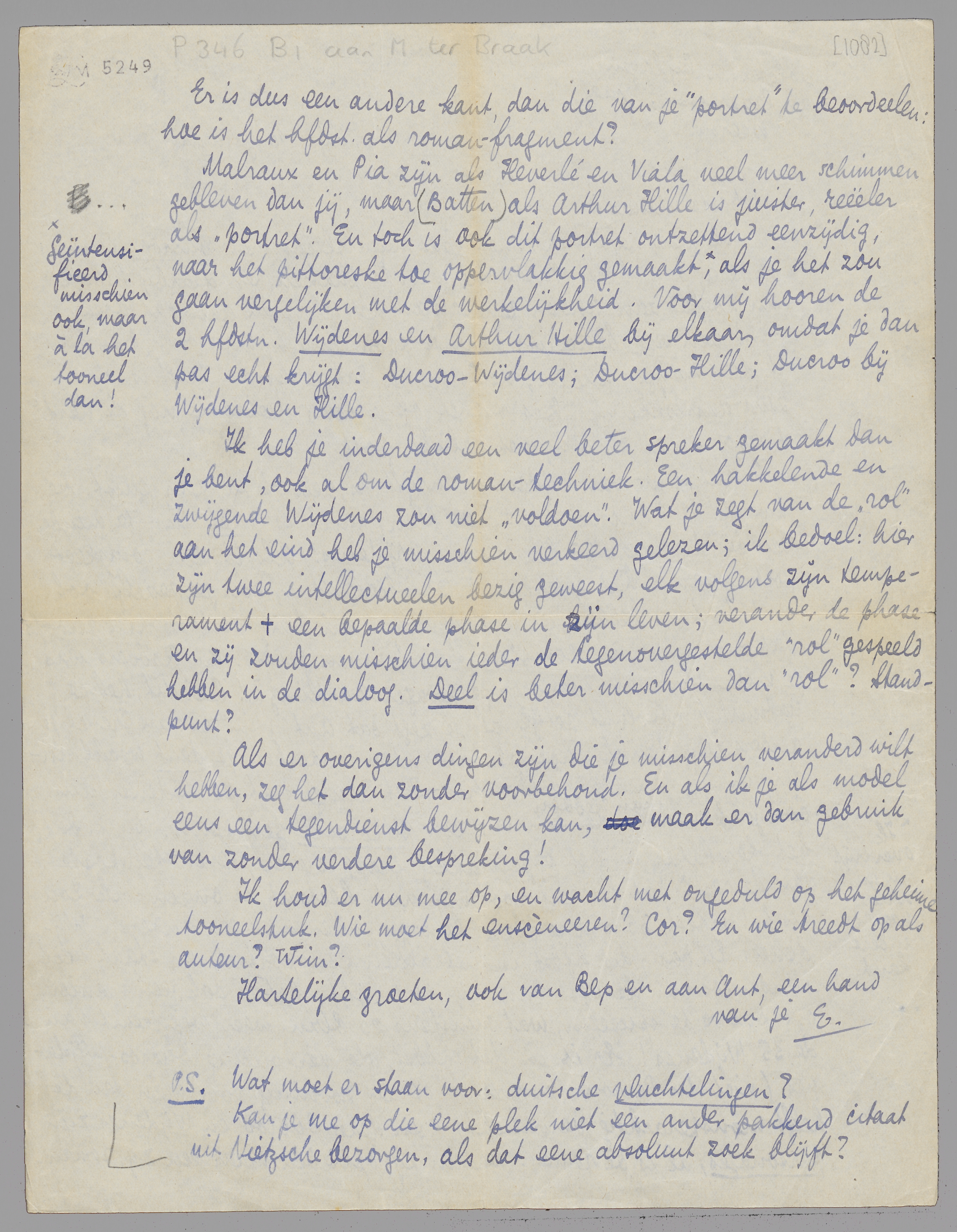 Malraux en Pia zijn als Heverlé en Viala veel meer schimmen gebleven dan jij, maar Batten als Arthur Hille is juister, reëeler als ‘portret’. En toch is ook dit portret ontzettend eenzijdig naar het pittoreske toe oppervlakkig gemaakt [Geïntensifieerd misschien ook, maar à la het tooneel dan!], als je het zou gaan vergelijken met de werkelijkheid. Voor mij hooren de 2 hfdstn. Wijdenes en Arthur Hille bij elkaar, omdat je dan pas echt krijgt: Ducroo-Wijdenes; Ducroo-Hille; Ducroo bij Wijdenes en Hille. Ik heb je inderdaad een veel beter spreker gemaakt dan je bent, ook al om de roman-techniek. Een hakkelende en zwijgende Wijdenes zou niet ‘voldoen.’ Wat je zegt van de ‘rol’ aan het eind heb je misschien verkeerd gelezen; ik bedoel: hier zijn twee intellectueelen bezig geweest elk volgens zijn temperament + een bepaalde phase in zijn leven; verander de phase en zij zouden misschien ieder de tegenovergestelde ‘rol’ gespeeld hebben in de dialoog. Deel is beter misschien dan ‘rol’? Standpunt?