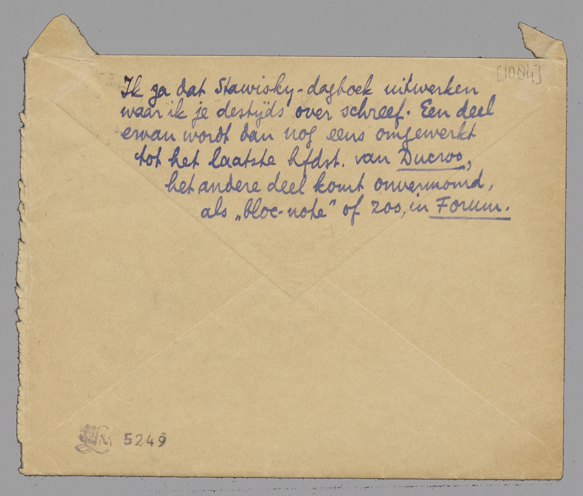 Ik ga dat Stawisky-dagboek uitwerken waar ik je destijds over schreef. Een deel ervan wordt dan nog eens omgewerkt tot het laatste hfdst. van Ducroo, het andere deel komt onvermomd, als ‘bloc-note’ of zoo, in Forum.