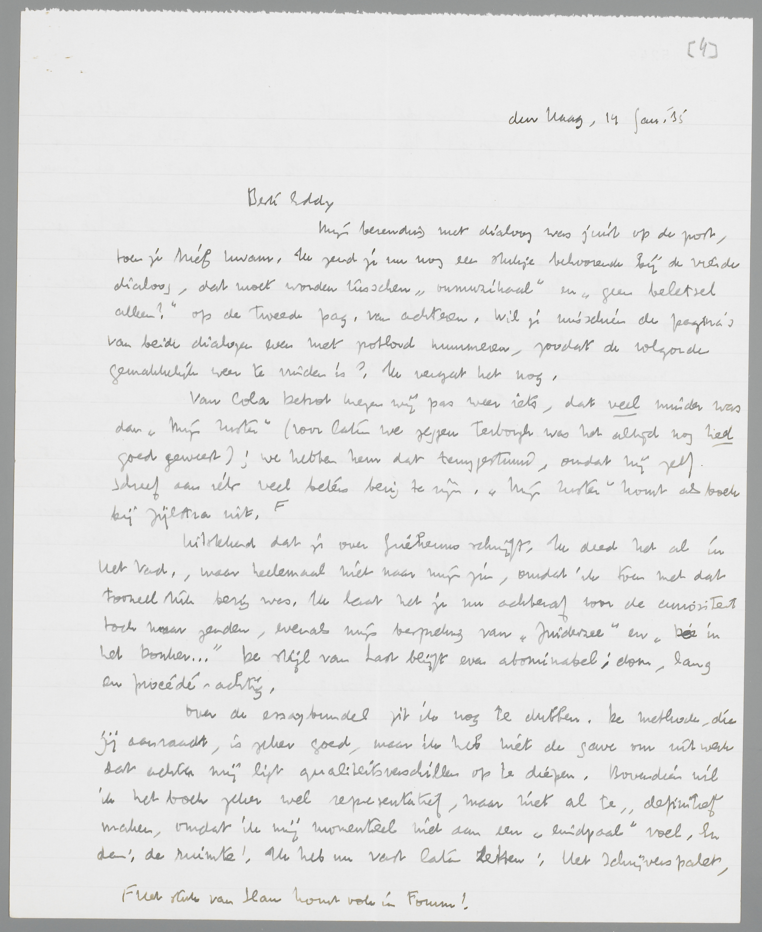 Mijn verzending met dialoog was juist op de post, toen je brief kwam. Ik zend je nu nog een stukje behoorende bij de vierde dialoog, dat moet worden tusschen ‘onmuzikaal’ en ‘geen beletsel alleen?’ op de tweede pag. van achteren. Wil je misschien de pagina's van beide dialogen even met potlood nummeren, zoodat de volgorde gemakkelijk weer te vinden is? Ik vergat het nog.