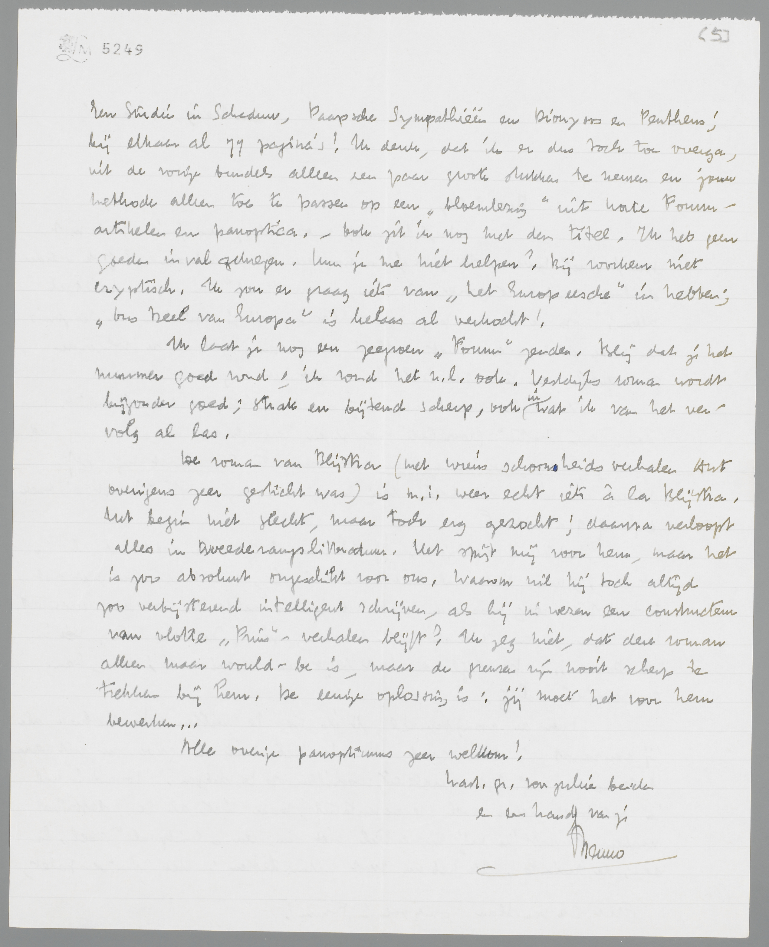 Ik laat je nog een zeegroen Forum zenden. Blij dat je het nummer goed vond; ik vond het n.l. ook. Vestdijks roman wordt bijzonder goed; strak en bijtend scherp, ook in wat ik van het vervolg al las.