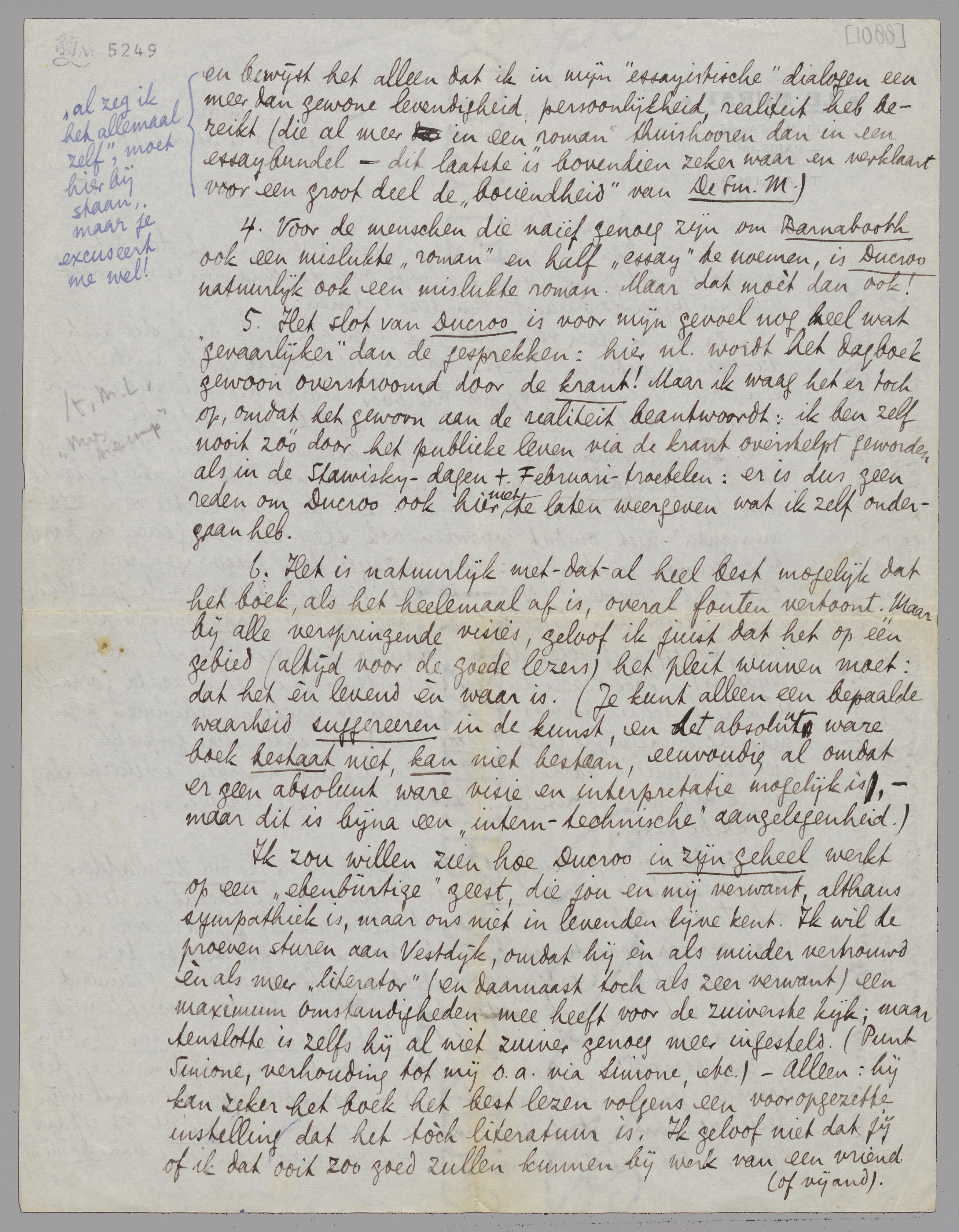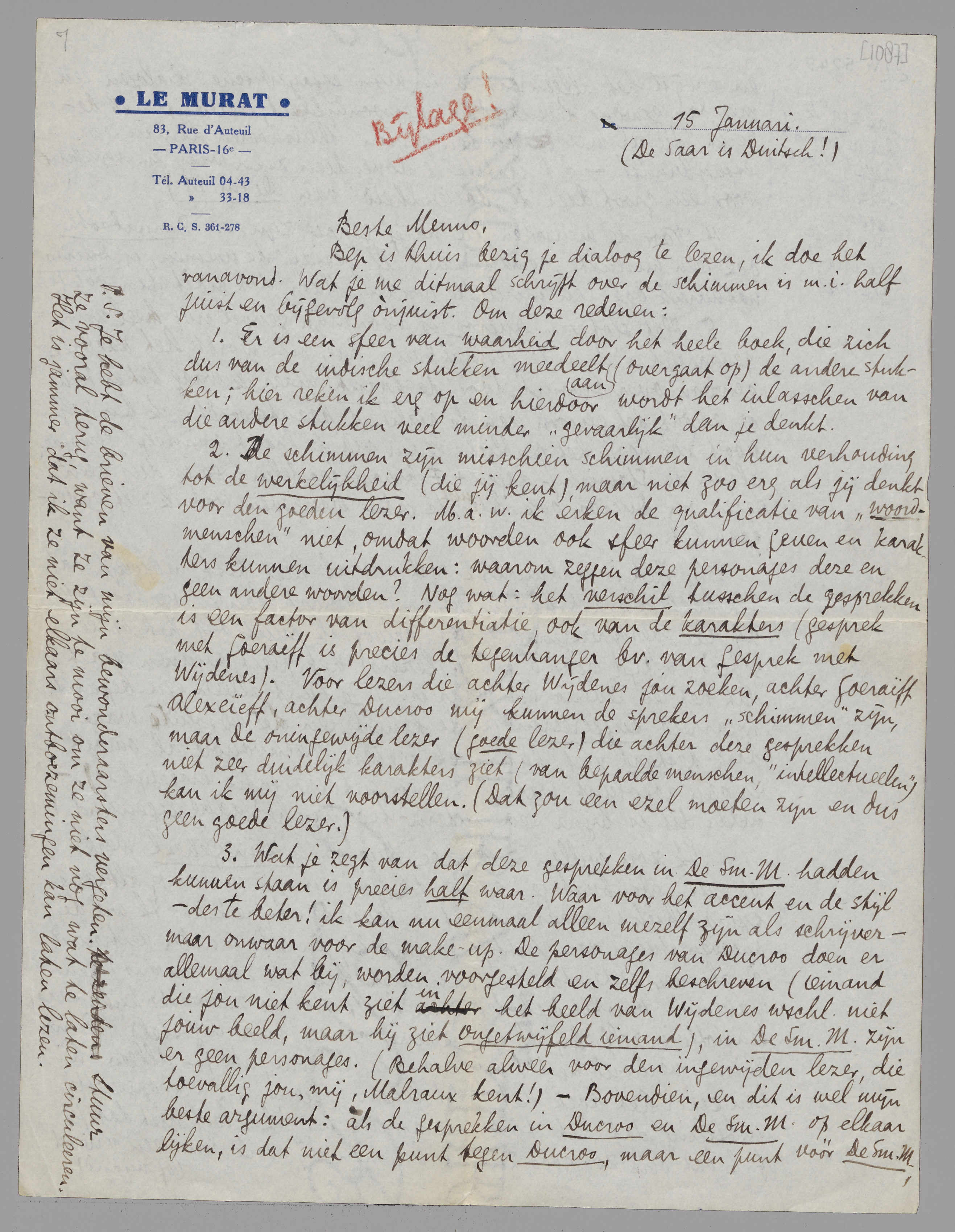 3. Wat je zegt van dat deze gesprekken in De Sm. M. hadden kunnen staan is precies half waar. Waar voor het accent en de stijl - des te beter! ik kan nu eenmaal alleen mezelf zijn als schrijver - maar onwaar voor de make-up. De personages van Ducroo doen er allemaal wat bij, worden voorgesteld en zelfs beschreven (iemand die jou niet kent ziet in het beeld van Wijdenes wschl. niet jouw beeld, maar hij ziet ongetwijfeld iemand), in De Sm. M. zijn er geen personages. (Behalve alweer voor den ingewijden lezer, die toevallig jou, mij, Malraux kent!) - Bovendien, en dit is wel mijn beste argument: als de gesprekken in Ducroo en De Sm. M. op elkaar lijken, is dat niet een punt tegen Ducroo, maar een punt vóór De Sm. M., [‘al zeg ik het allemaal zelf’, moet hierbij staan, maar je excuseert me wel!] en bewijst het alleen dat ik in mijn ‘essayistische’ dialogen een meer dan gewone levendigheid, persoonlijkheid, realiteit heb bereikt (die al meer in een ‘roman’ thuishooren dan in een essaybundel - dit laatste is bovendien zeker waar en verklaart voor een groot deel de ‘boeiendheid’ van De Sm. M.)