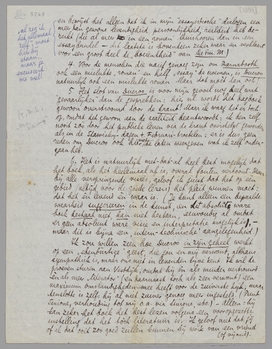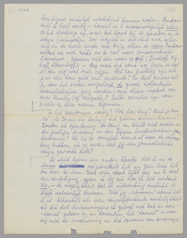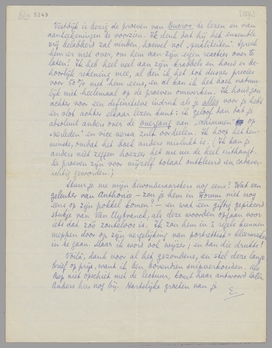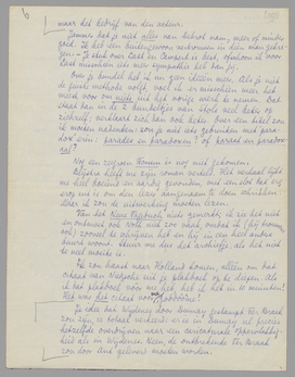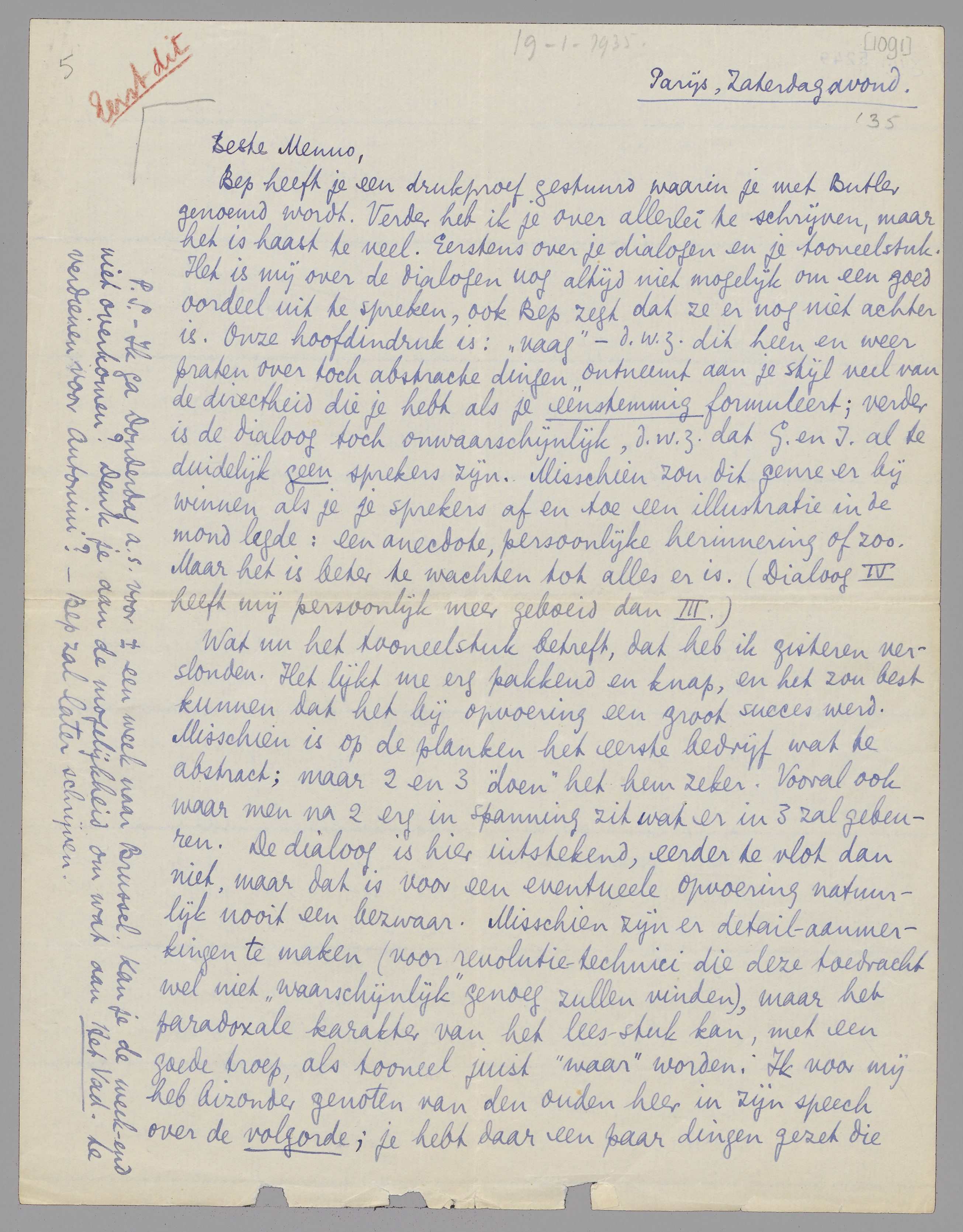 Bep heeft je een drukproef gestuurd waarin je met Butler genoemd wordt. Verder heb ik je over allerlei te schrijven, maar het is haast te veel. Eerstens over je dialogen en je tooneelstuk. Het is mij over de dialogen nog altijd niet mogelijk om een goed oordeel uit te spreken, ook Bep zegt dat ze er nog niet achter is. Onze hoofdindruk is: ‘vaag’ - d.w.z. dit heen en weer praten over toch abstracte dingen ontneemt aan je stijl veel van de directheid die je hebt als je éénstemmig formuleert; verder is de dialoog toch onwaarschijnlijk, d.w.z. dat G. en J. al te duidelijk geen sprekers zijn. Misschien zou dit genre er bij winnen als je je sprekers af en toe een illustratie in de mond legde: een anecdote, persoonlijke herinnering of zoo. Maar het is beter te wachten tot alles er is. (Dialoog IV heeft mij persoonlijk meer geboeid dan III.)