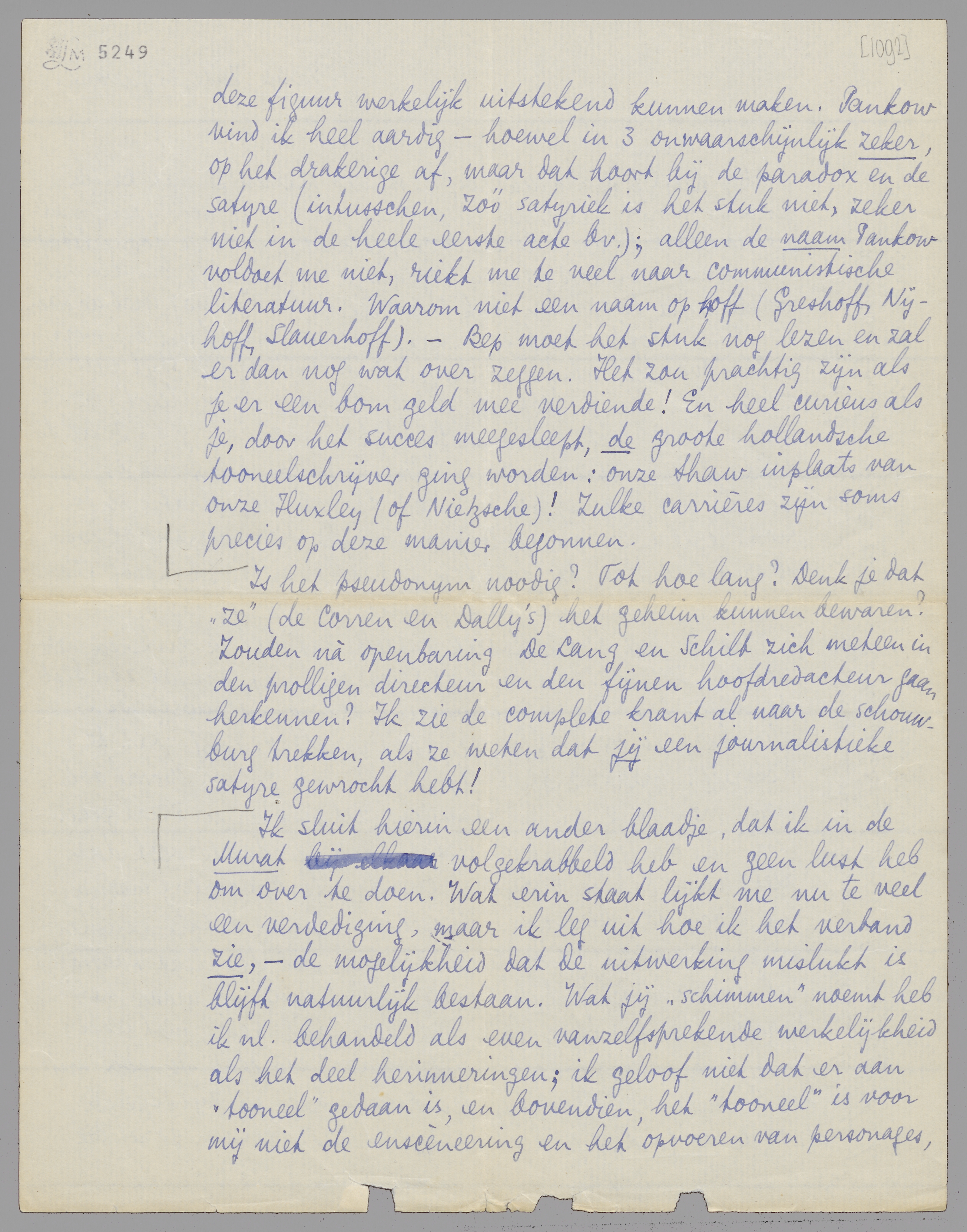 Is het pseudonym noodig? Tot hoe lang? Denk je dat ‘ze’ (de Corren en Dally's) het geheim kunnen bewaren? Zouden nà openbaring De Lang en Schilt zich meteen in den prolligen directeur en den fijnen hoofdredacteur gaan herkennen? Ik zie de complete krant al naar de schouwburg trekken, als ze weten dat jij een journalistieke satyre gewrocht hebt!