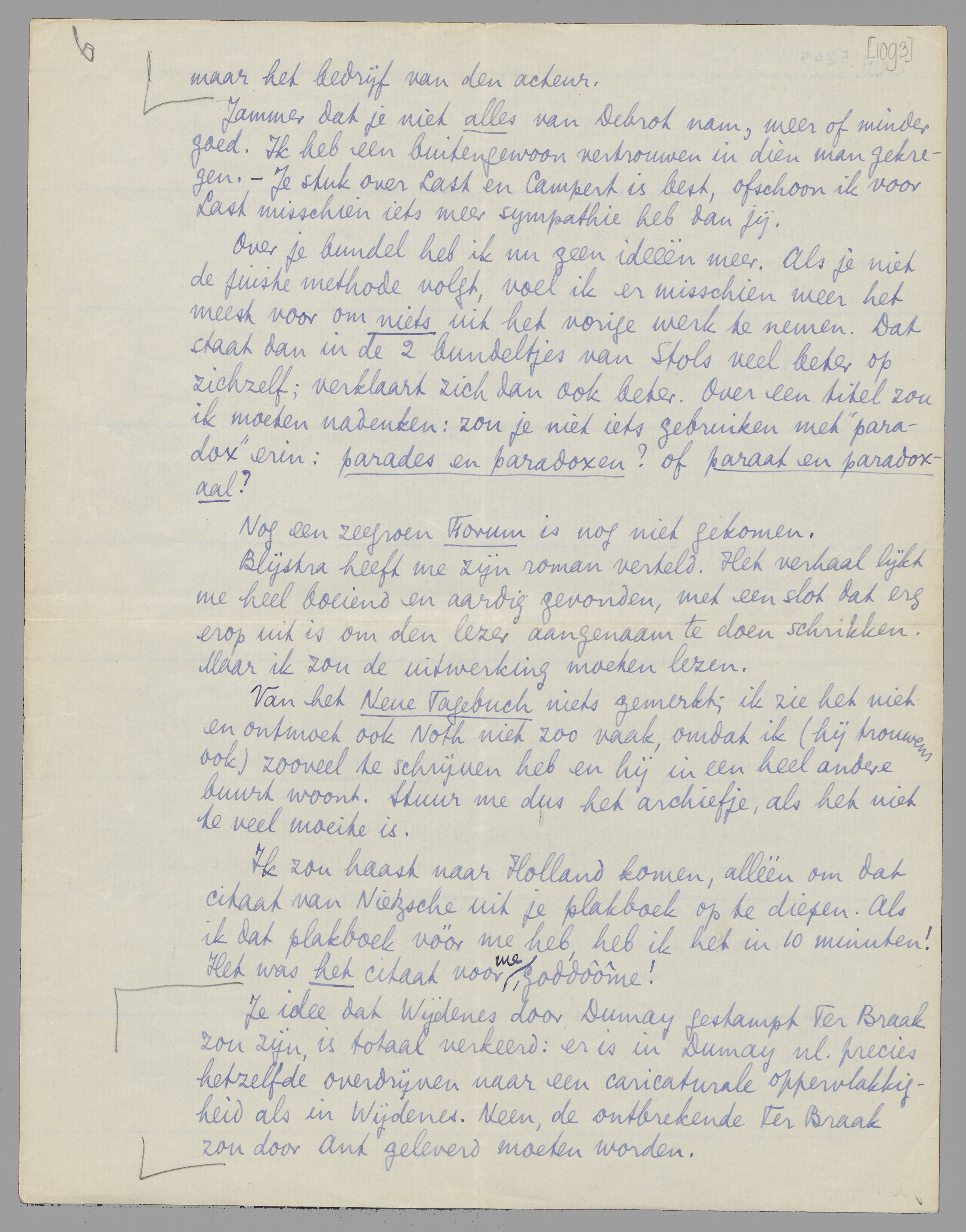 Jammer dat je niet alles van Debrot nam, meer of minder goed. Ik heb een buitengewoon vertrouwen in dien man gekregen. - Je stuk over Last en Campert is best, ofschoon ik voor Last misschien iets meer sympathie heb dan jij. Over je bundel heb ik nu geen ideeën meer. Als je niet de juiste methode volgt, voel ik er misschien weer het meest voor om niets uit het vorige werk te nemen. Dat staat dan in de 2 bundeltjes van Stols veel beter op zichzelf; verklaart zich dan ook beter. Over een titel zou ik moeten nadenken: zou je niet iets gebruiken met ‘paradox’ erin: parades en paradoxen? of paraat en paradoxaal?