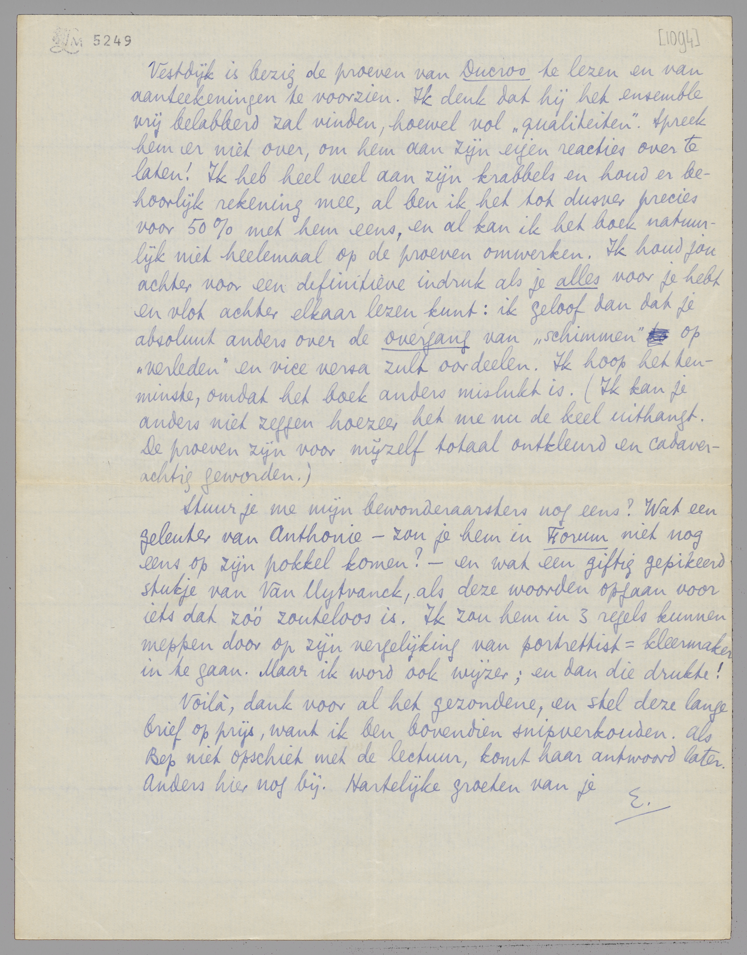 Ik zou willen zien hoe Ducroo in zijn geheel werkt op een ‘ebenbürtige’ geest, die jou en mij verwant, althans sympathiek is, maar ons niet in levenden lijve kent. Ik wil de proeven sturen aan Vestdijk, omdat hij èn als minder vertrouwd èn als meer ‘literator’ (en daarnaast toch als zeer verwant) een maximum omstandigheden mee heeft voor de zuiverste kijk; maar tenslotte is zelfs hij al niet zuiver genoeg meer ingesteld. (Punt Simone, verhouding tot mij o.a. via Simone, etc.) - alleen: hij kan zeker het boek best lezen volgens een vooropgezette instelling dat het tòch literatuur is. Ik geloof niet dat jij of ik dat ooit zoo goed zullen kunnen bij werk van een vriend (of vijand).