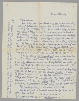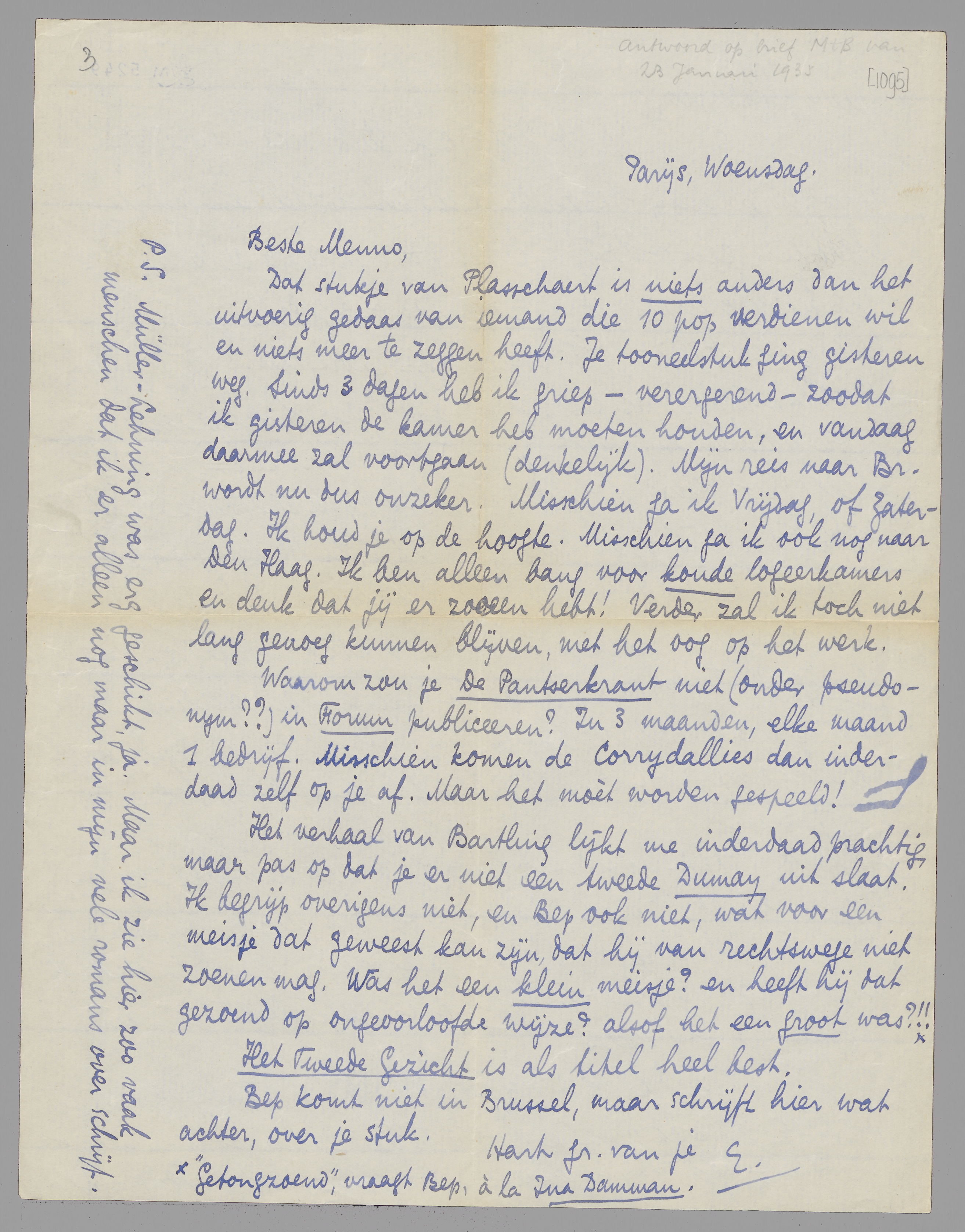 Dat stukje van Plasschaert is niets anders dan het uitvoerig gedaas van iemand die 10 pop verdienen wil en niets meer te zeggen heeft. Je tooneelstuk ging gisteren weg. Sinds 3 dagen heb ik griep - verergerend - zoodat ik gisteren de kamer heb moeten houden, en vandaag daarmee zal voortgaan (denkelijk). Mijn reis naar Br. wordt nu dus onzeker. Misschien ga ik Vrijdag, of Zaterdag. Ik houd je op de hoogte. Misschien ga ik ook nog naar Den Haag. Ik ben alleen bang voor koude logeerkamers en denk dat jij er zooeen hebt! Verder zal ik toch niet lang genoeg kunnen blijven, met het oog op het werk.