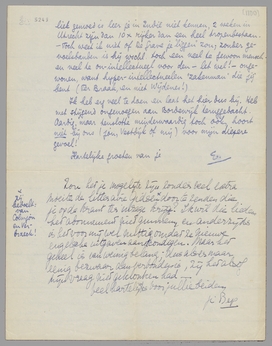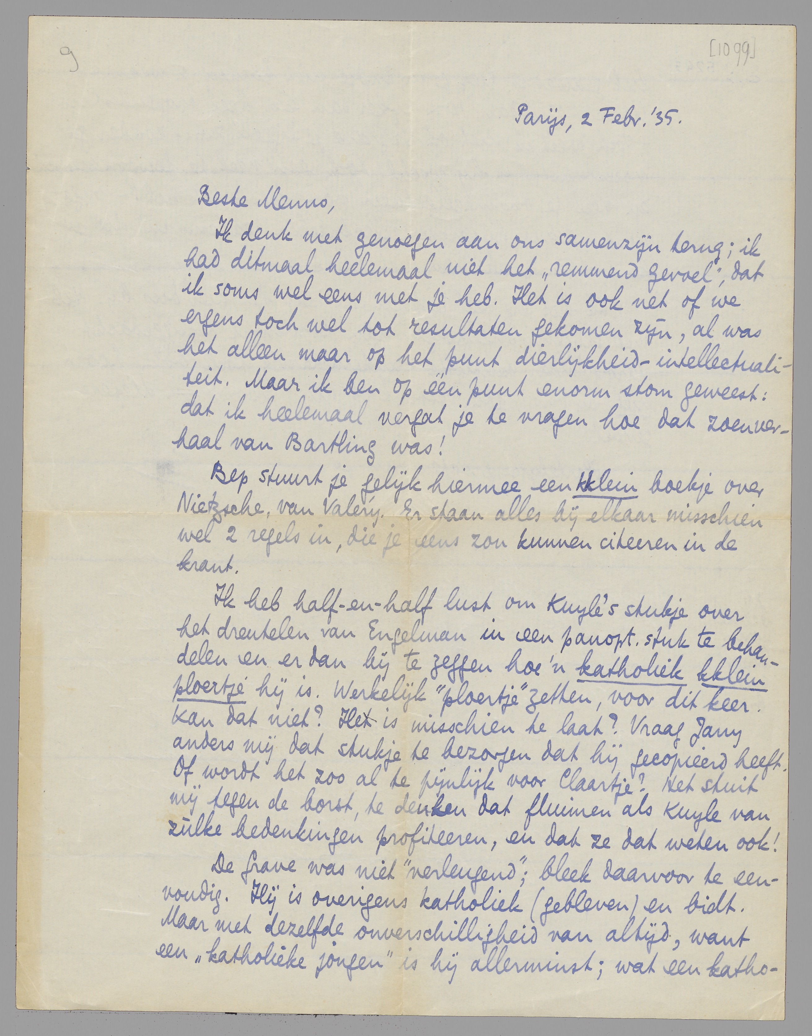Ik heb half-en-half lust om Kuyle's stukje over het drentelen van Engelman in een panopt. stuk te behandelen en er dan bij te zeggen hoe'n katholiek kklein ploertje hij is. Werkelijk ‘ploertje’ zetten, voor dit keer. Kan dat niet? Het is misschien te laat? Vraag Jany anders mij dat stukje te bezorgen dat hij gecopieerd heeft. Of wordt het zoo al te pijnlijk voor Claartje. Het stuit mij tegen de borst, te denken dat fluimen als Kuyle van zùlke bedenkingen profiteeren, en dat ze dat weten ook!