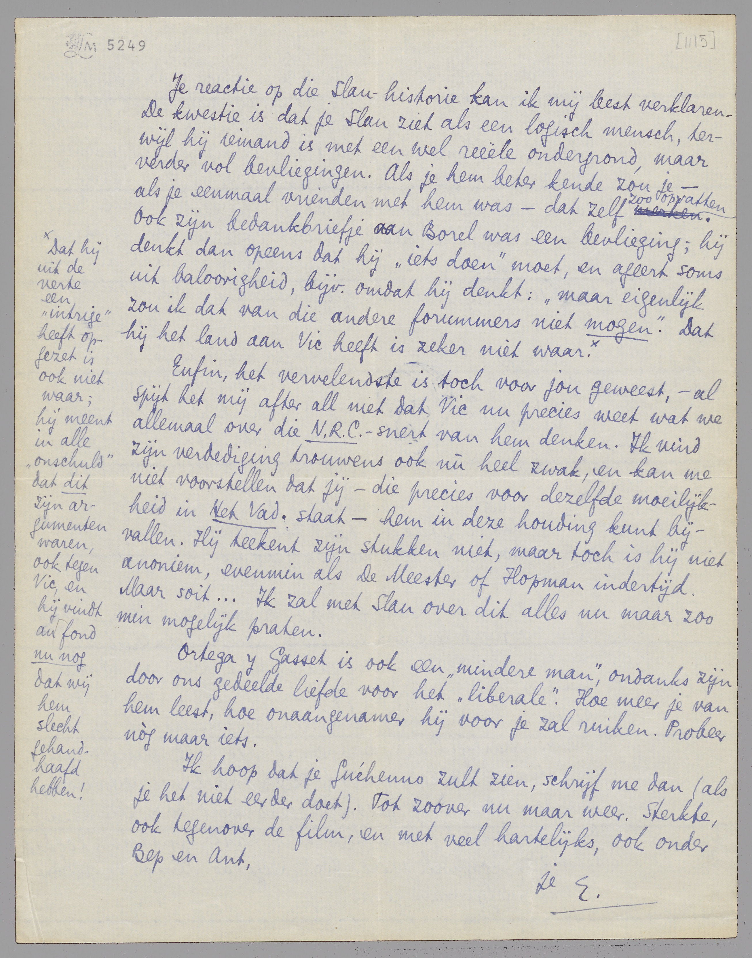 Ortega y Gasset is ook een ‘mindere man’, ondanks zijn door ons gedeelde liefde voor het ‘liberale’. Hoe meer je van hem leest, hoe onaangenamer hij voor je zal ruiken. Probeer nòg maar iets. Ik hoop dat je Guéhenno zult zien, schrijf me dan (als je het niet eerder doet). Tot zoover nu maar weer. Sterkte, ook tegenover de film, en met veel hartelijks, ook onder Bep en Ant,