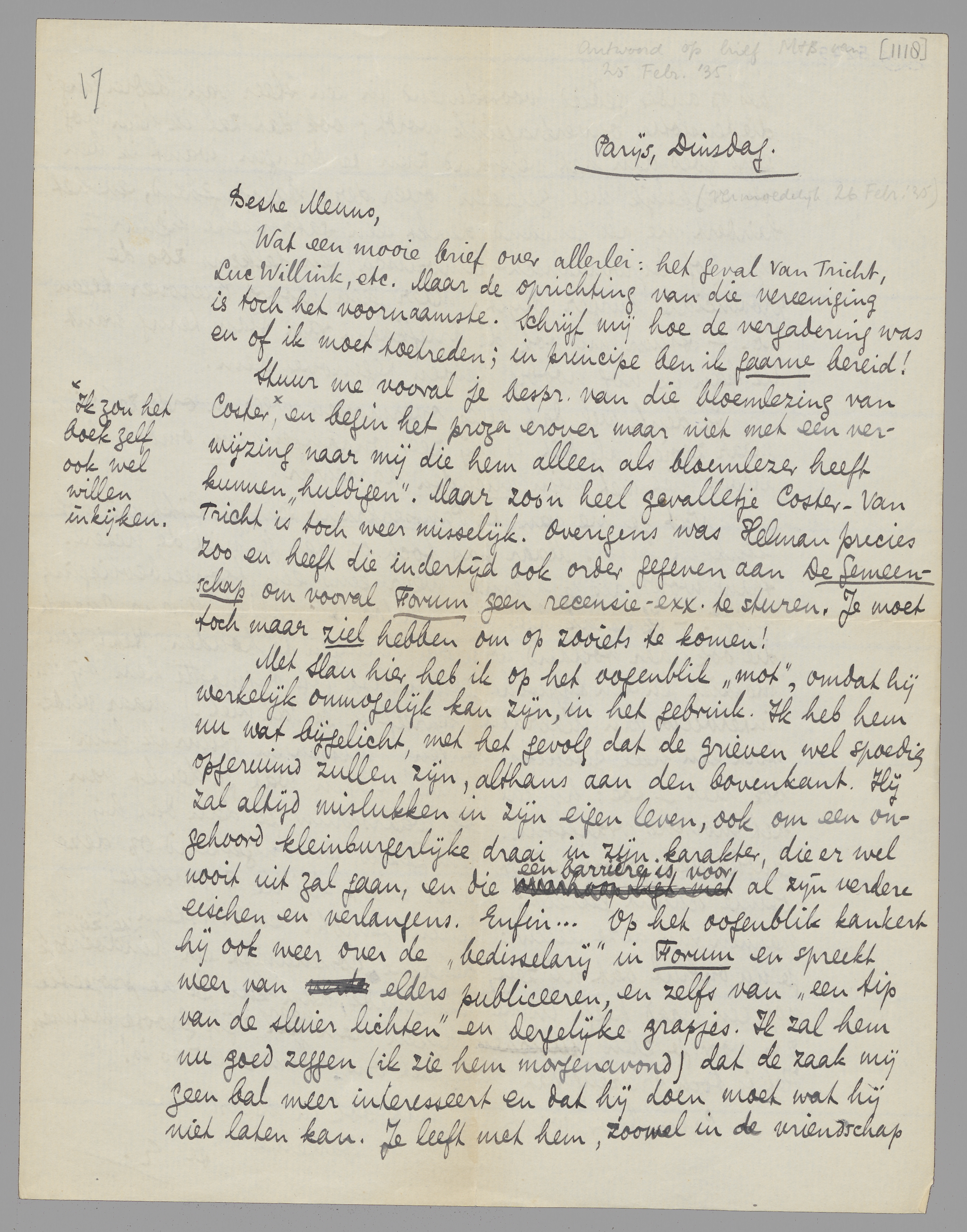 Stuur me vooral je bespr. van die bloemlezing van Coster [Ik zou het boek zelf ook wel willen inkijken], en begin het proza erover maar niet met een verwijzing naar mij die hem alleen als bloemlezer heeft kunnen ‘huldigen’. Maar zoo'n heel gevalletje Coster-Van Tricht is toch weer misselijk. Overigens was Helman precies zoo en heeft die indertijd ook order gegeven aan De Gemeenschap om vooral Forum geen recensie-exx. te sturen. Je moet toch maar ziel hebben om op zooiets te komen!