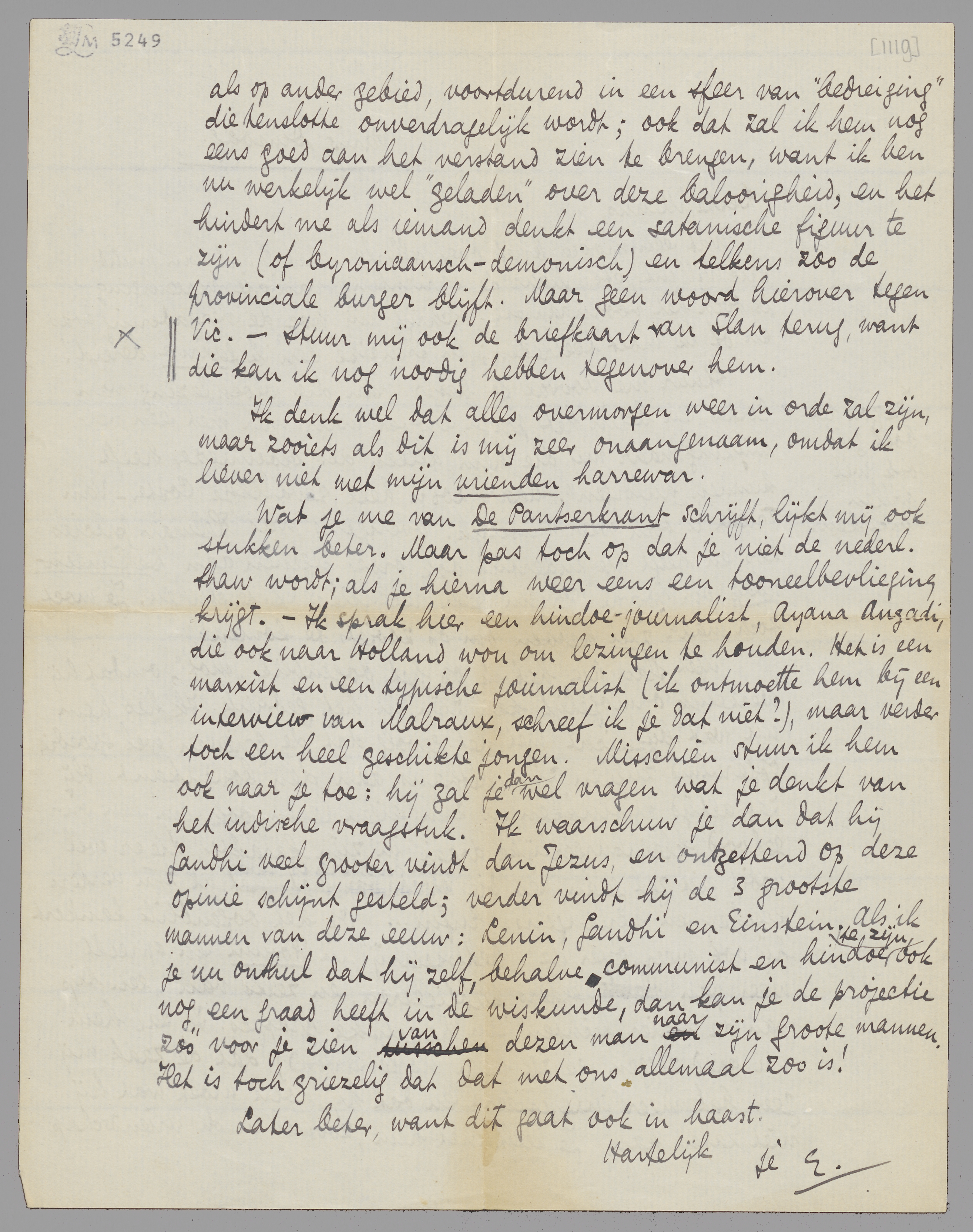 Wat je me van de Pantserkrant schrijft, lijkt mij ook stukken beter. Maar pas toch op dat je niet de Nederl. Shaw wordt; als je hierna weer eens een tooneelbevlieging krijgt. - Ik sprak hier een hindoe-journalist, Ayana Angadi, die ook naar Holland wou om lezingen te houden. Het is een marxist en een typische journalist (ik ontmoette hem bij een interview van Malraux, schreef ik je dat niet?), maar verder toch een heel geschikte jongen. Misschien stuur ik hem ook naar je toe: hij zal je dan wel vragen wat je denkt van het indische vraagstuk. Ik waarschuw je dan dat hij Gandhi veel grooter vindt dan Jezus, en ontzettend op deze opinie schijnt gesteld; verder vindt hij de 3 grootste mannen van deze eeuw: Lenin, Gandhi en Einstein. Als ik je nu onthul dat hij zelf, behalve communist en hindoe te zijn, ook nog een graad heeft in de wiskunde, dan kan je de projectie zóó voor je zien van dezen man naar zijn groote mannen. Het is toch griezelig dat dat met ons allemaal zoo is!