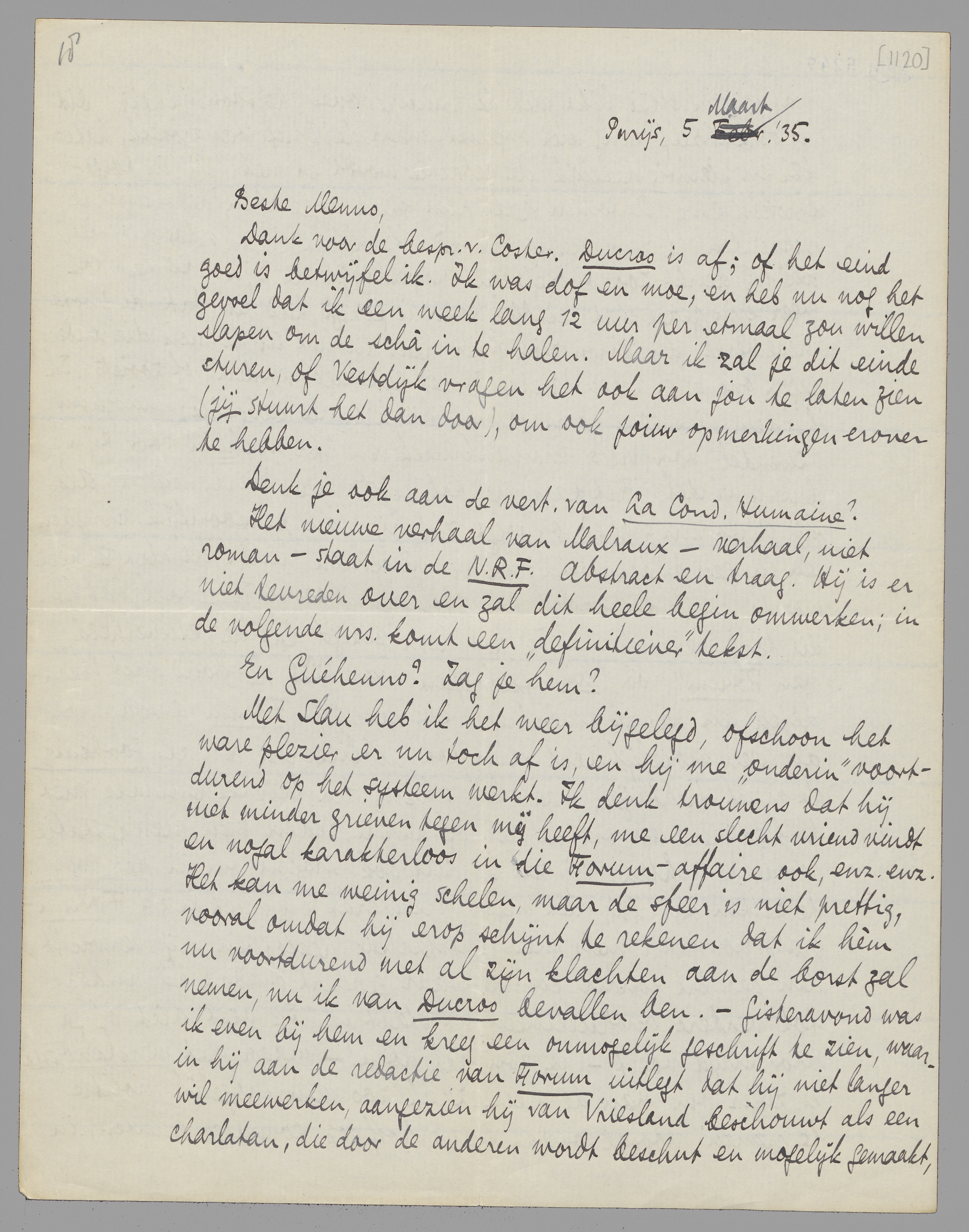 Het nieuwe verhaal van Malraux - verhaal, niet roman - staat in de N.R.F. Abstract en traag. Hij is er niet tevreden over en zal dit heele begin omwerken; in de volgende nrs. komt een ‘definitieve’ tekst.