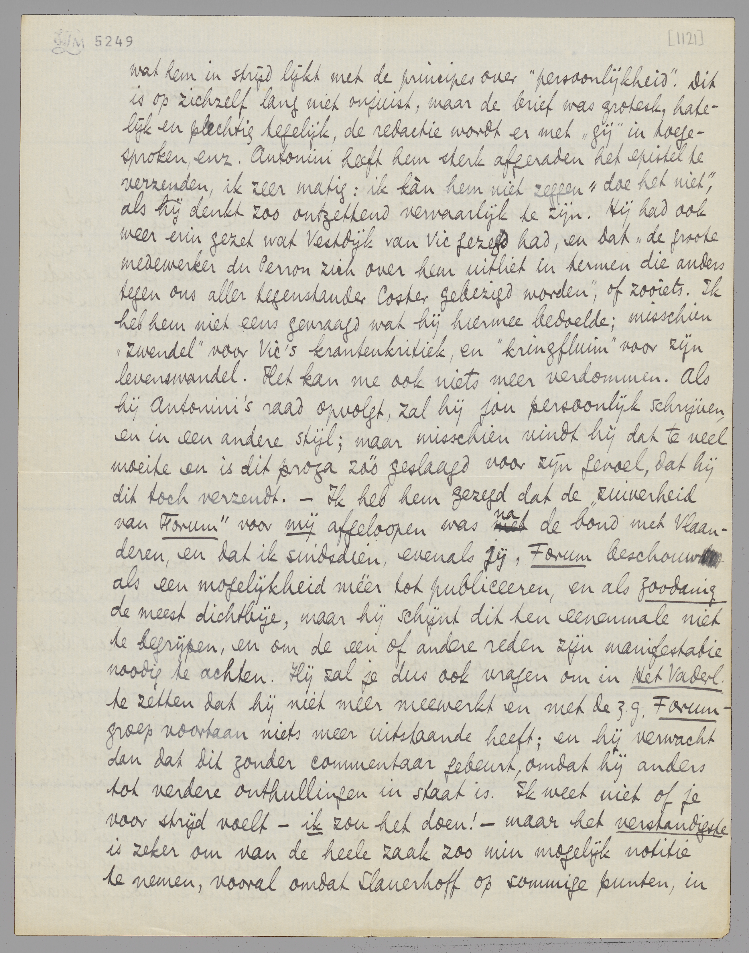 Met Slau heb ik het weer bijgelegd, ofschoon het ware plezier er nu toch af is, en hij me ‘onderin’ voortdurend op het systeem werkt. Ik denk trouwens dat hij niet minder grieven tegen mij heeft, me een slecht vriend vindt en nogal karakterloos in die Forum-affaire ook, enz. enz. Het kan me weinig schelen, maar de sfeer is niet prettig, vooral omdat hij er op schijnt te rekenen dat ik hèm nu voortdurend met al zijn klachten aan de borst zal nemen, nu ik van Ducroo bevallen ben. - Gisteravond was ik even bij hem en kreeg een onmogelijk geschrift te zien, waarin hij aan de redactie van Forum uitlegt dat hij niet langer wil meewerken, aangezien hij van Vriesland beschouwt als een charlatan, die door de anderen wordt beschut en mogelijk gemaakt, wat hem in strijd lijkt met de principes over ‘persoonlijkheid’. Dit is op zichzelf lang niet onjuist, maar de brief was grotesk, hatelijk en plechtig tegelijk, de redactie wordt er met ‘gij’ in toegesproken, enz. Antonini heeft hem sterk afgeraden het epistel te verzenden, ik zeer matig: ik kàn hem niet zeggen ‘doe het niet’, als hij denkt zoo ontzettend vervaarlijk te zijn. Hij had ook weer erin gezet wat Vestdijk van Vic gezegd had, en dat ‘de groote medewerker du Perron zich over hem uitliet in termen die anders tegen ons aller tegenstander Coster gebezigd worden’, of zooiets. Ik heb hem niet eens gevraagd wat hij hiermee bedoelde; misschien ‘zwendel’ voor Vic's krantenkritiek, en ‘kringfluim’ voor zijn levenswandel. Het kan me ook niets meer verdommen. Als hij Antonini's raad opvolgt, zal hij jou persoonlijk schrijven, en in een andere stijl; maar misschien vindt hij dat te veel moeite en is dit proza zóó geslaagd voor zijn gevoel, dat hij dit toch verzendt. - Ik heb hem gezegd dat de ‘zuiverheid van Forum’ voor mij afgeloopen was na de bond met Vlaanderen, en dat ik sindsdien, evenals jij, Forum beschouw als een mogelijkheid méér tot publiceeren, en als zoodanig de meest dichtbije, maar hij schijnt dit ten eenenmale niet te begrijpen, en om de een of andere reden zijn manifestatie noodig te achten. Hij zal je dus ook vragen om in Het Vaderl. te zetten dat hij niet meer meewerkt en met de z.g. Forum-groep voortaan niets meer uitstaande heeft; en hij verwacht dan dat dit zonder commentaar gebeurt, omdat hij anders tot verdere onthullingen in staat is. Ik weet niet of je voor strijd voelt - ik zou het doen! - maar het verstandigste is zeker om van de heele zaak zoo min mogelijk notitie te nemen, vooral omdat Slauerhoff op sommige punten, in principe, tòch gelijk heeft. Dat wij - ik reken mijzelf er nu maar bij - Vic's prestaties èn zijn houding lullig vinden en hem om ‘fatsoensredenen’ toch als medeleider van Forum handhaven is natuurlijk toch waar. Dit heeft op zichzelf met de baloorige en onhandige manier van aanpakken van Slauerhoff niets te maken. Hij vindt dat hij met het excuus van Vic geen genoegen hoeft te nemen, dat hij Vic compleet een vod blijft vinden, en bijgevolg zich niet meer in Forum thuisvoelt. Van meewerken aan De Stem tot dusver geen sprake. Hij zegt dat hij van plan is minder te publiceeren en dat Elsevier's en Groot-Nederland ruim genoeg voor hem zijn; wat dat betreft hoef je hem dus niet direct van het antipathiekste te verdenken. (Bovendien, Vestdijk publiceert toch ook in De Stem! dit argument ligt voor het rapen.) Enfin, ik heb nu weer een hoop hierover geschreven, meer om jou een goed begrip van het geval bij te brengen, en omdat Slau er mij toch telkens weer mee aan boord komt; persoonlijk vind ik het een vervelende, kinderachtige historie.