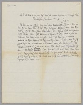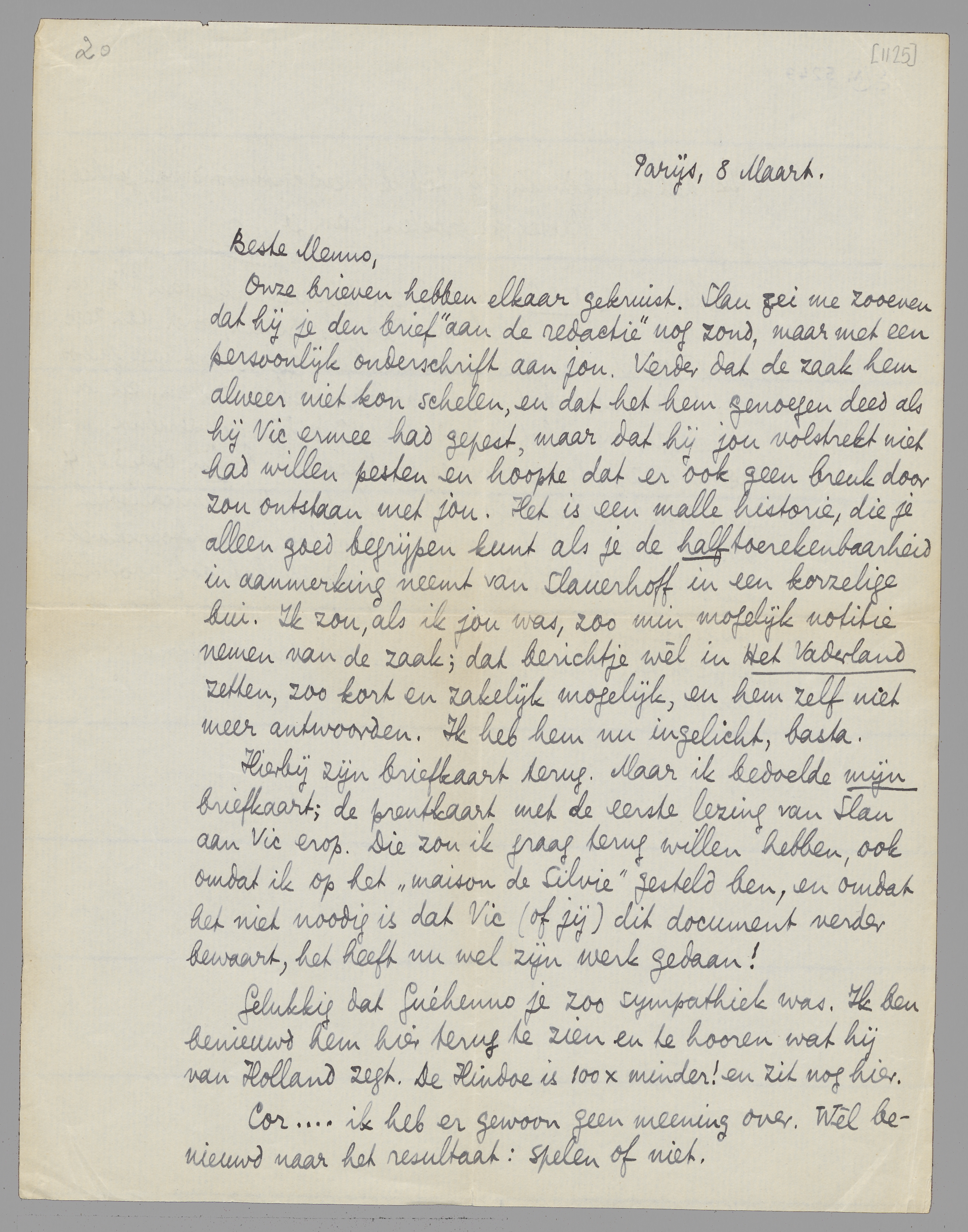 Onze brieven hebben elkaar gekruist. Slau zei me zooeven dat hij je den brief ‘aan de redactie’ nog zond, maar met een persoonlijk onderschrift aan jou. Verder dat de zaak hem alweer niet kon schelen, en dat het hem genoegen deed als hij Vic ermee had gepest, maar dat hij jou volstrekt niet had willen pesten en hoopte dat er ook geen breuk door zou ontstaan met jou. Het is een malle historie, die je alleen goed begrijpen kunt als je de halftoerekenbaarheid in aanmerking neemt van Slauerhoff in een korzelige bui. Ik zou, als ik jou was, zoo min mogelijk notitie nemen van de zaak; dat berichtje wèl in Het Vaderland zetten, zoo kort en zakelijk mogelijk, en hem zelf niet meer antwoorden. Ik heb hem nu ingelicht, basta.